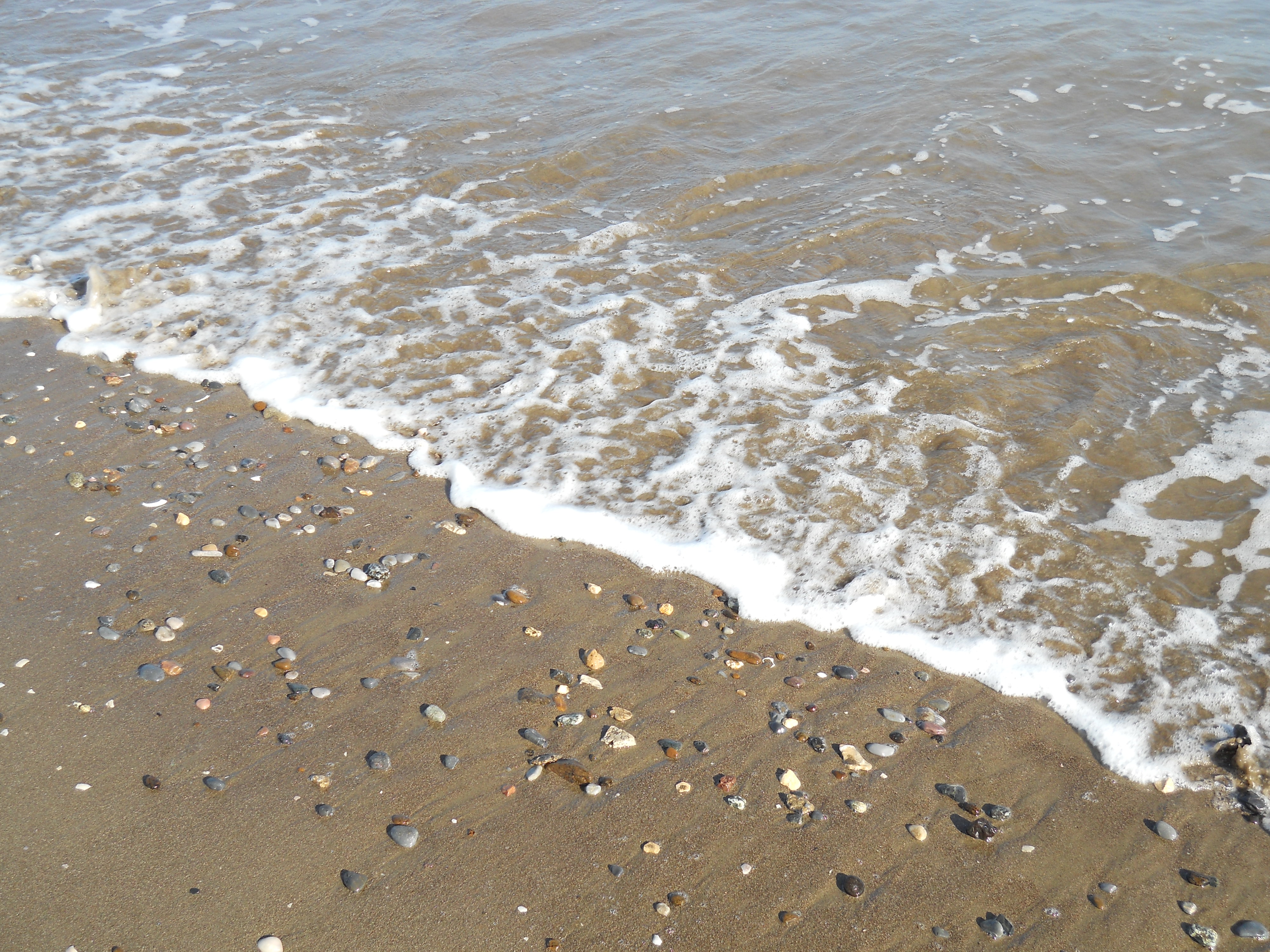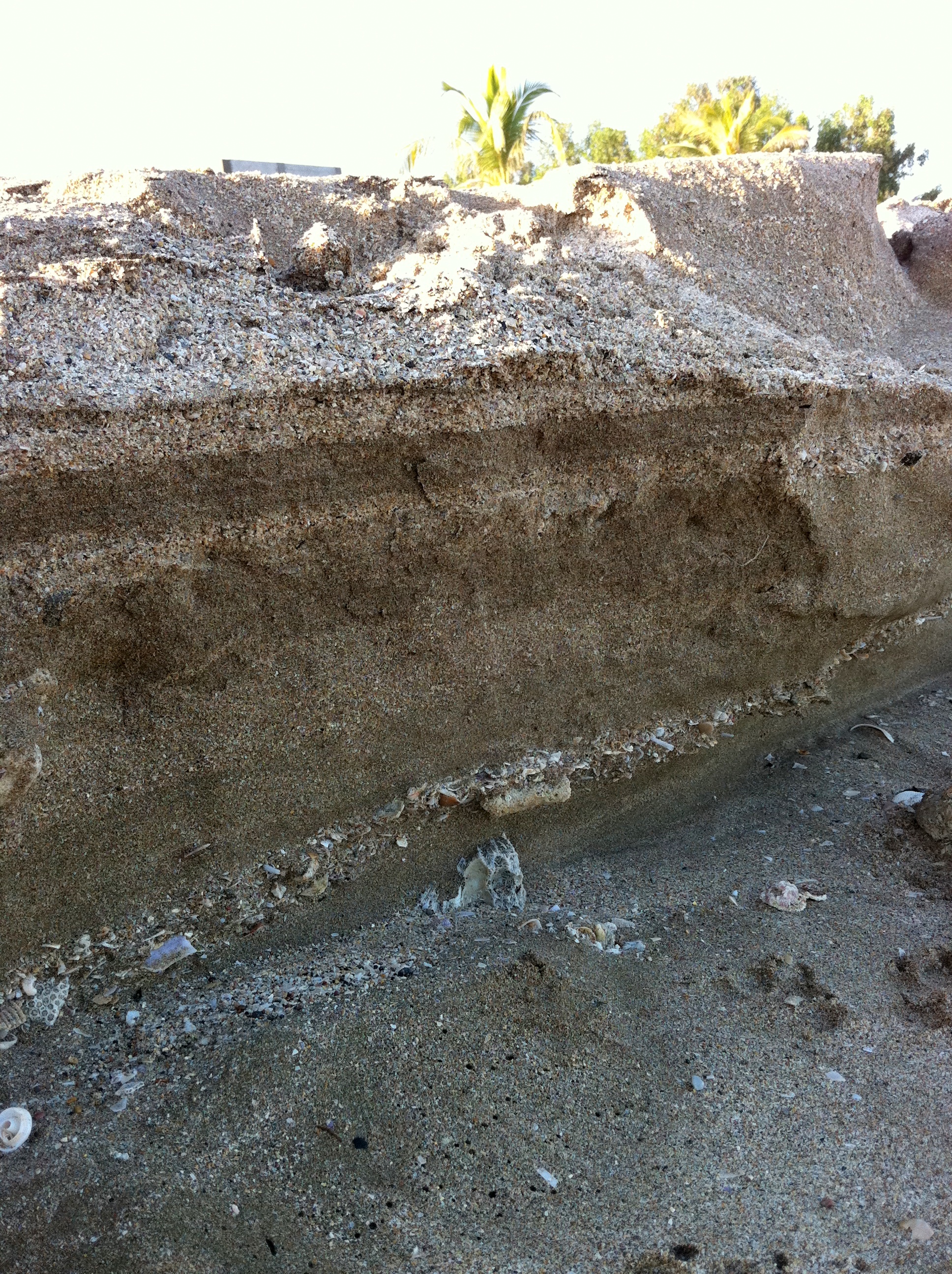 Sometimes the sea brings a lot of sand in with the high tides, and all the small and broken shells get covered up. It takes days for the water to gradually reclaim the sand and uncover the treasures. Often, the water cuts into the bank, and the layers of sand and shell that have built