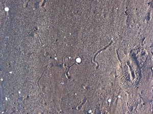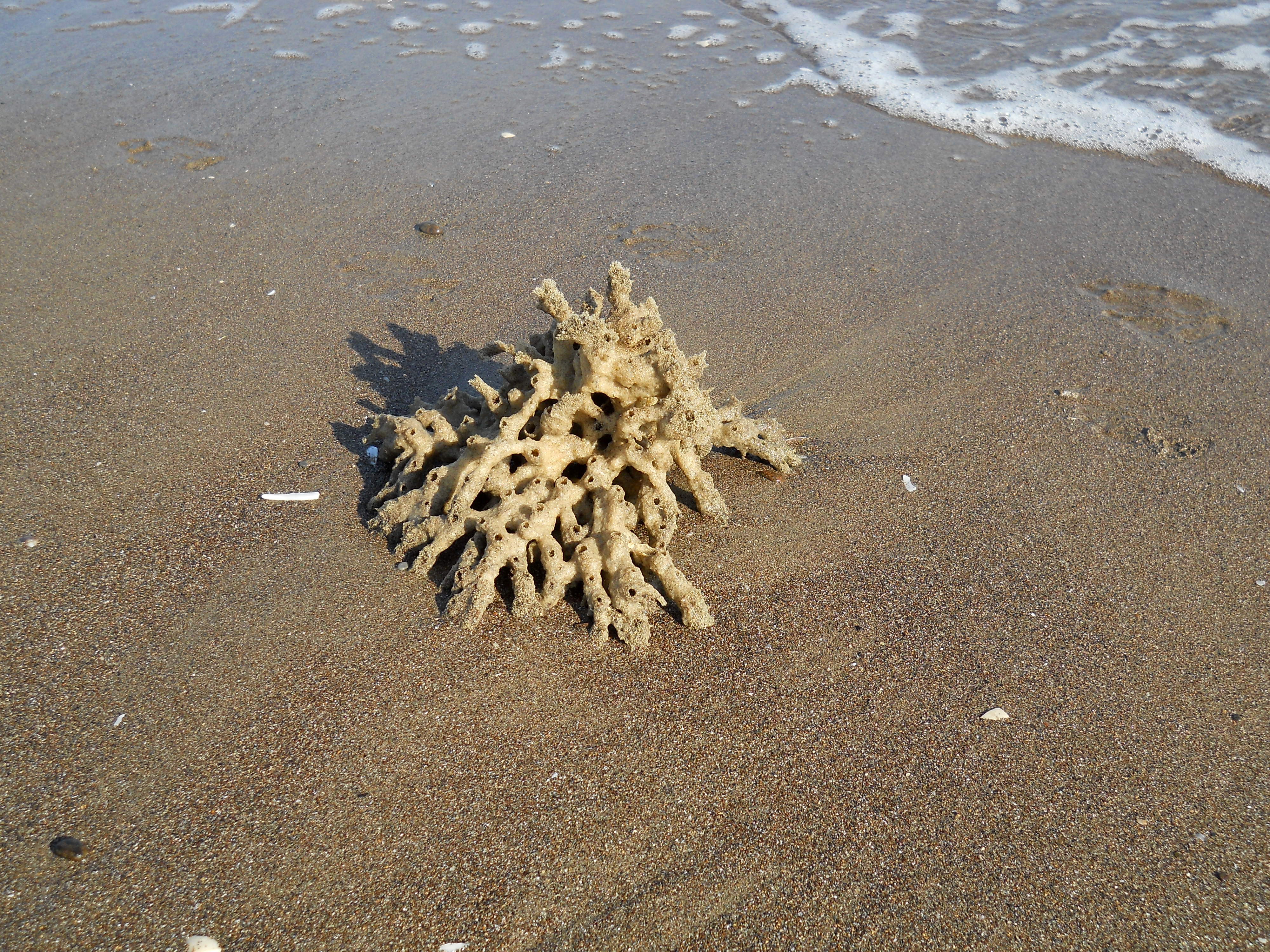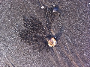 snakes, a few star fish, bits of broken fishing net, and many kinds of coral. The tracks in the sand made by hermit crabs, snails and the water running back into the sea make interesting patterns as well. Some crabs dig holes in the sand and throw the sand out in a spray pattern. Male ghost crabs build a tower beside their hole during mating season