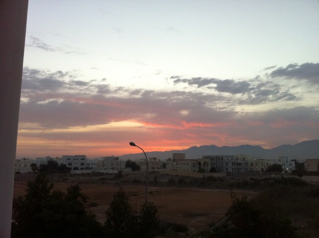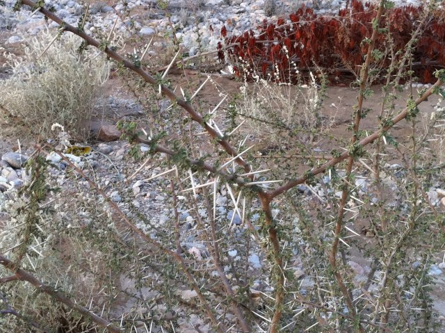 We walked through the wadi a different way. Now, a wadi is a dry river bed, or we’d call it a water run back home. Lots of these they now call “abandoned” here, as the flow patterns have been changed with all the building. Lots of plants grow there in among the gravel. Many wild plants here have very small leaves, and very large thorns. This one particularly caught my eye (and thankfully, not my clothing) as we walked by.