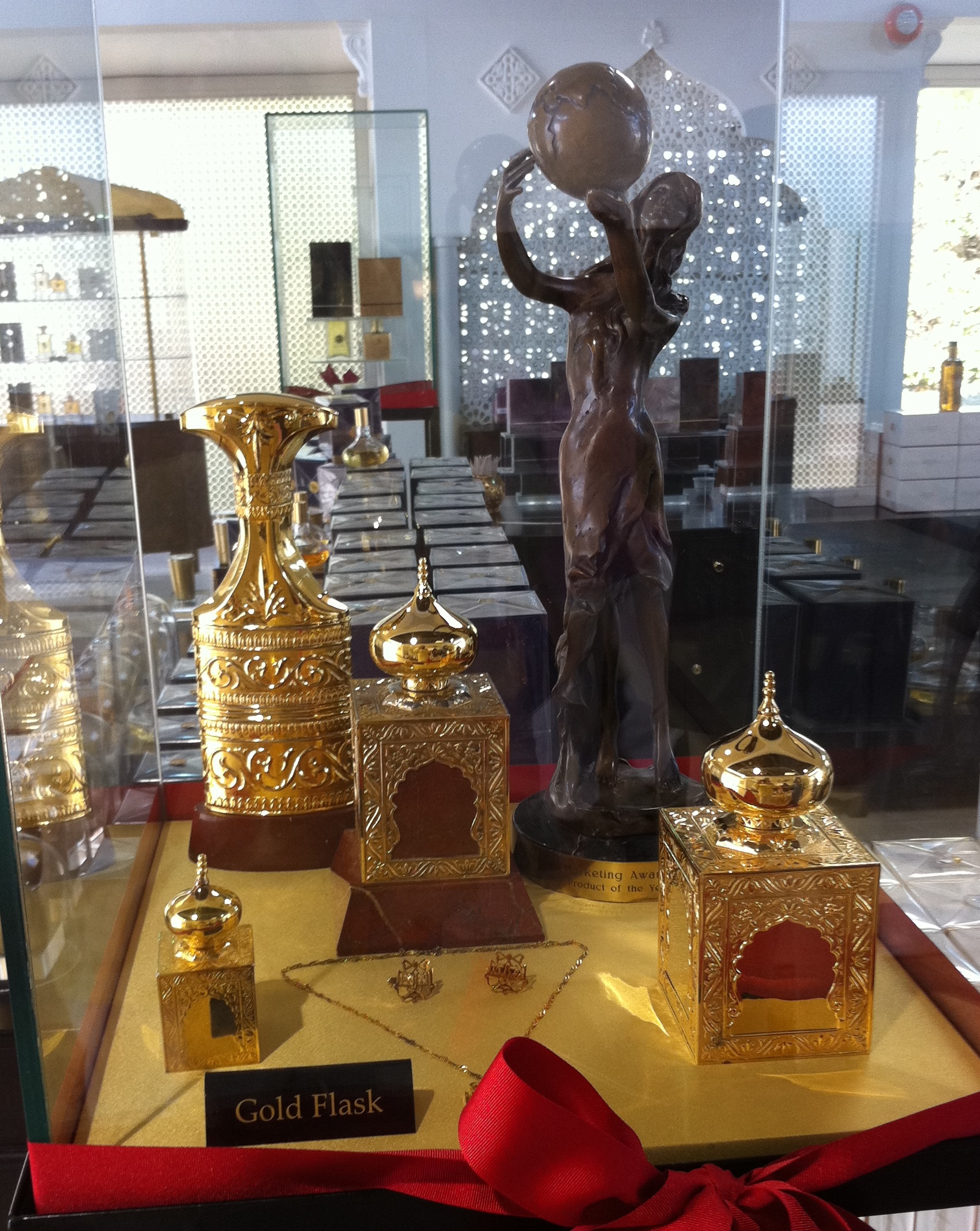 First, we were shown around the gallery.  The traditional bottles have a mosque-shaped top on the ladies’ perfume, and the top of a Khanjar or traditional Omani knife on the mens’.  The first perfume created was Amouage Gold.  they also have a display of fancy, gold bottles – I’m not sure if you can buy the, but I’m sure they would be expensive.