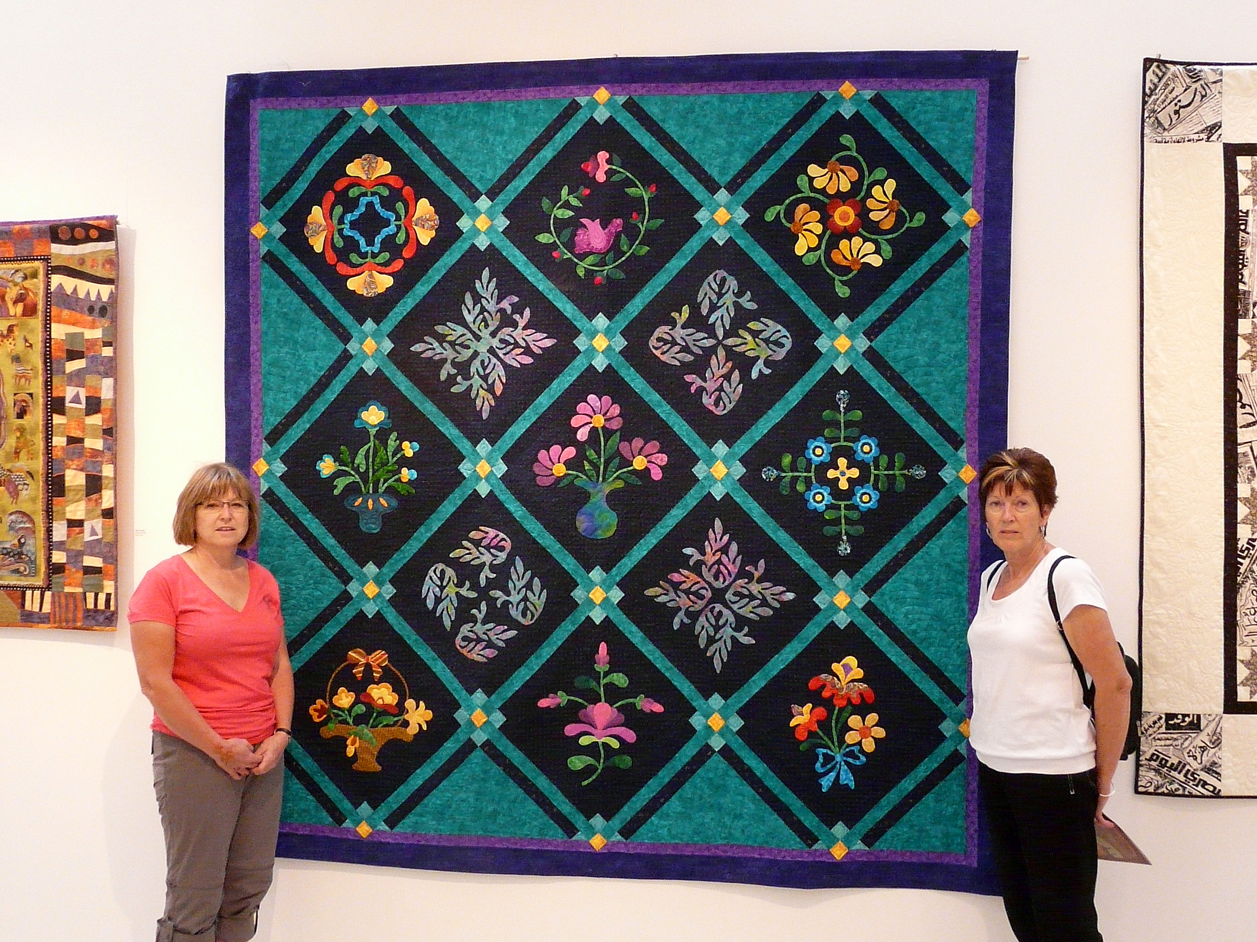 Anyway, here is a photo of the quilt in the show, taken by Dawn Ewen’s camera, and featuring her and Colleen.