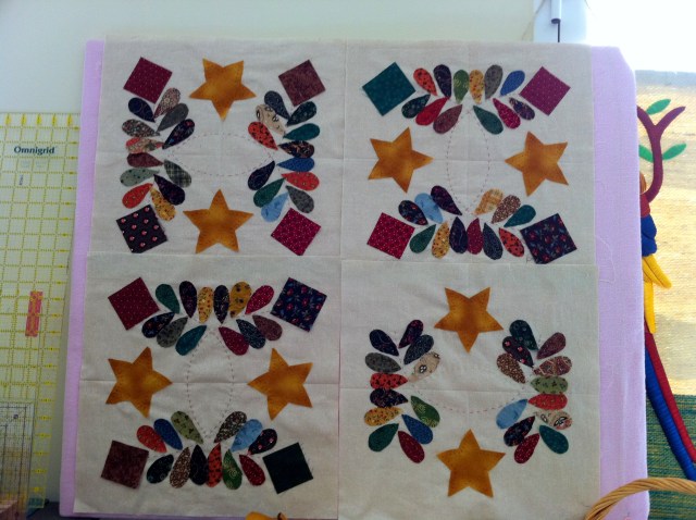 I’ve been busy getting some handwork ready for my trip – finally found a pattern I want to do, while I wait to get my own design worked out.  Here are the first four blocks, all set to go.  The squares are just stuck on… they will be leaves, but can’t be basted on until the stems are done.  There are also 5 similar blocks with red stars…. set in a 9-patch arrangement.  I have some Hawaiian-style applique ready to teach Corinne’s friends while I’m there as well.