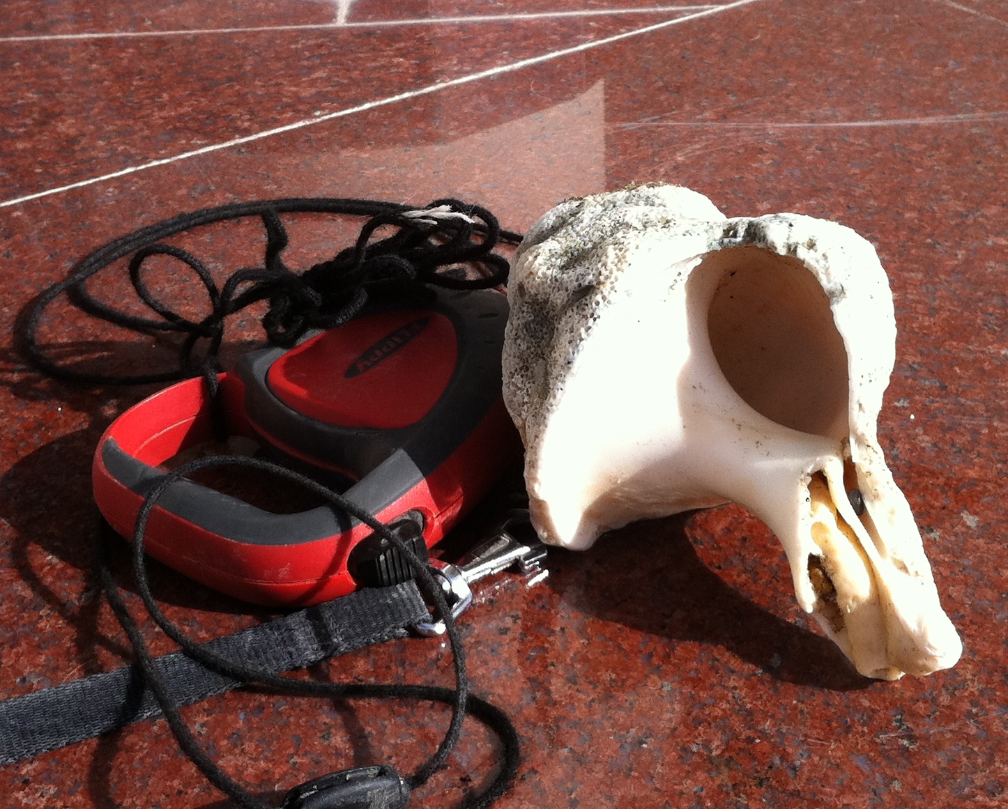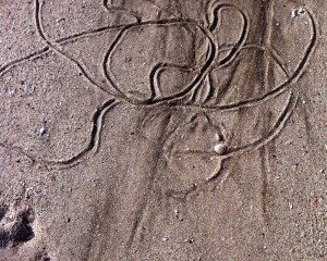 I’m constantly amazed at how the beach changes.  The boat ramp that was once totally covered by sand….. and then uncovered again, has undergone a further transformation…. more sand has been moved out so it is down to the rocks underneath.  The plastic traffic barrier that was once under almost 2 feet of sand is now sitting half uncovered.  There were some very interesting snail trails in the sand….. and I found a very large shell, half buried among the stones.  The dog leash beside it (about hand size) gives you an idea of the scale.
