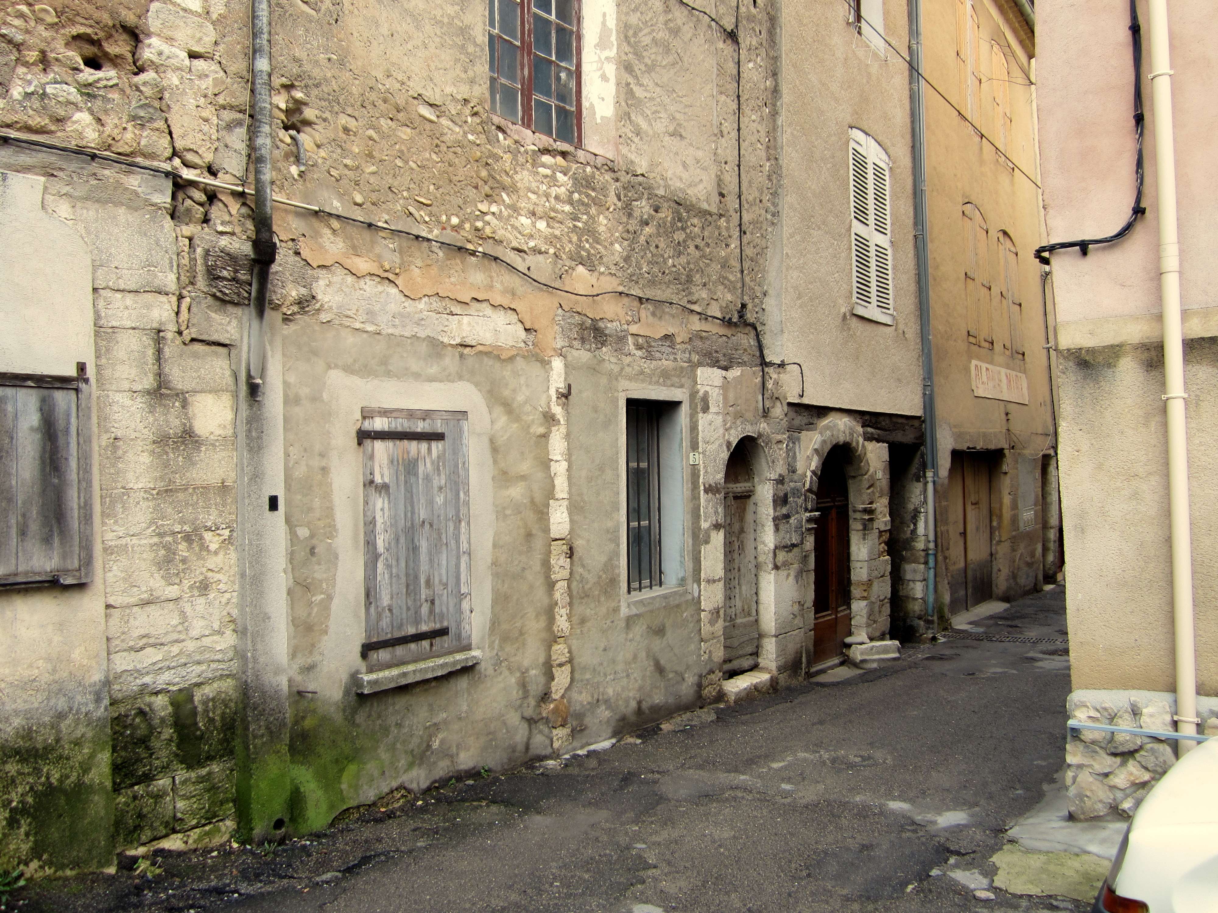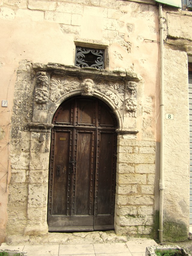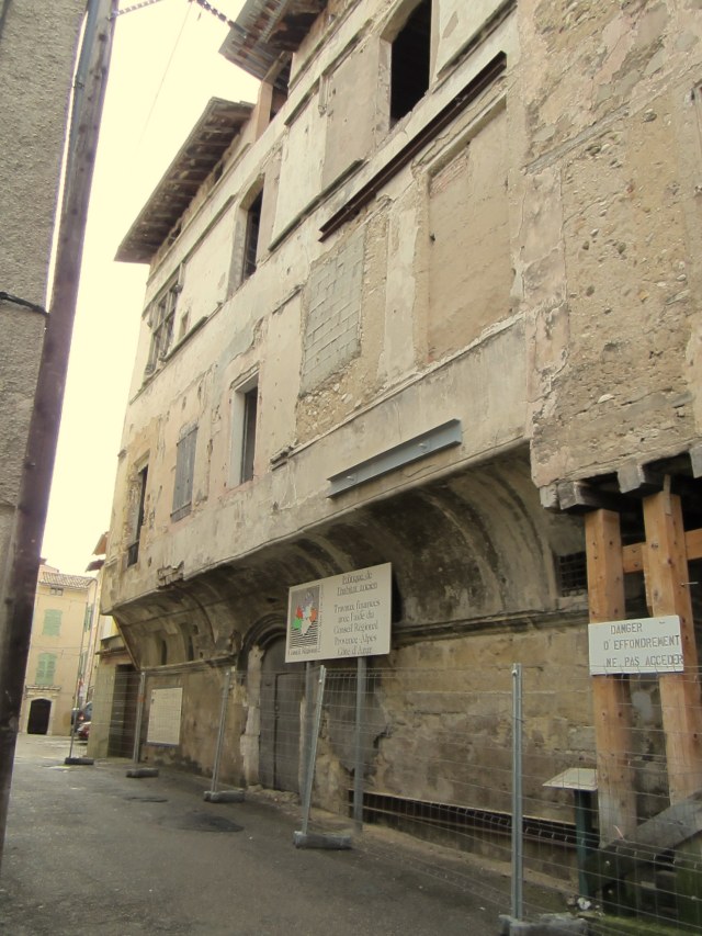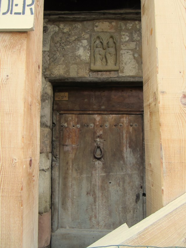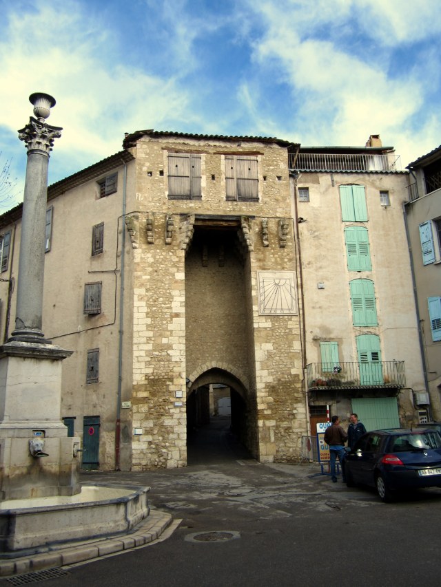 I started out by entering the old village through the grand Porte or Gate Ayguière which dates back to the 14th century.  Notice the sundial.  The streets are narrow and the houses tall… many dating from the 14th, 15th, and 16th centuries.  One sees grand coats of arms and other gypsum decorations around the doors and windows.  There  are several buildings which are listed as historic and are being restored…from the photos of the insides in some of the brochures they will be truly amazing when opened. This hotel was RENOVATED in 1510.