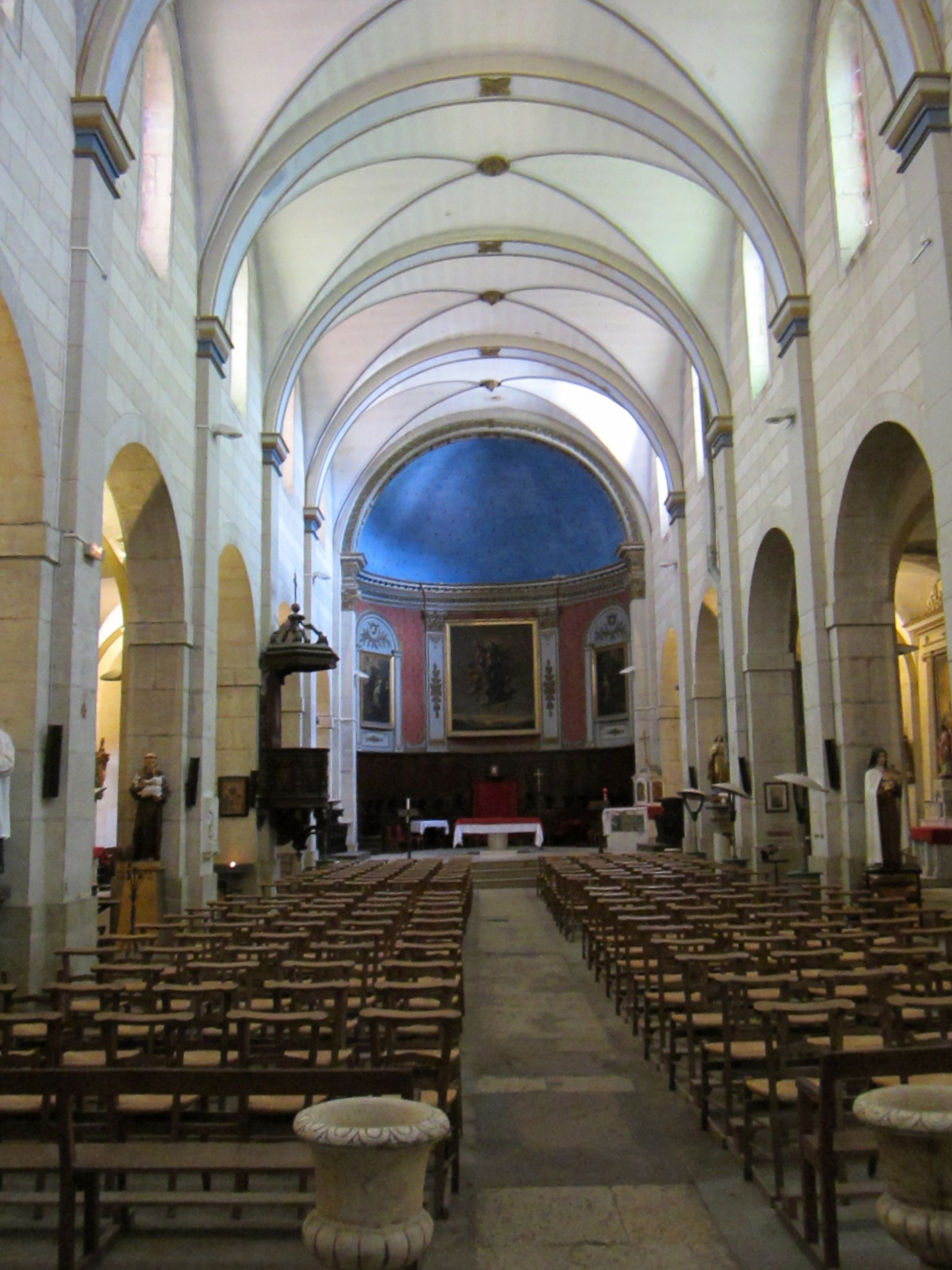 Going down and out the gate, I stopped next at the church.  Early in Christian times, Riez became the seat of a Bishop. The modern church just dates back to the 19th century, but it was very beautifulThis shot is taken from over by the columns, and shows both the church steeple and the clock tower, with Sainte Maxime’s hill in the background.