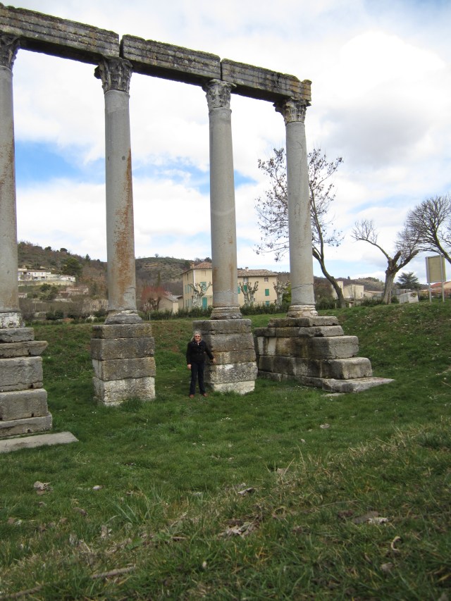 In a flat spot near the river, four majestic columns stand tall, remnants of a temple to Apollo.  I set my camera on one of the large stones which circle the columns, set the timer, and raced down the muddy slope…. here you can see just how tall they are.