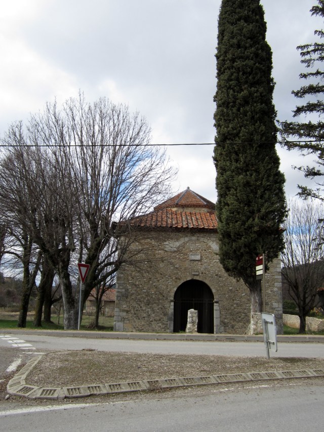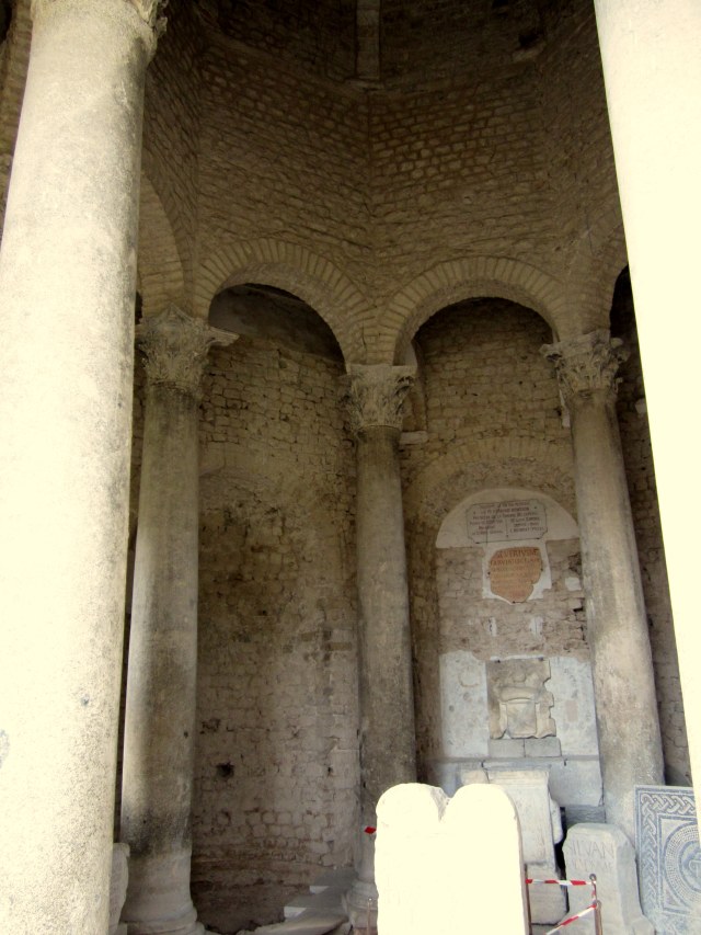 On I went, past the site of a convent dating back to the 13th century, of which only this gothic arch window still survives…… it was destroyed during the religious was of 1574.  That kind of old has quite an impact on a Canadian from the Prairies, where nothing is nearly that old.  I visited the Roman colums, already mentioned, and then went through the mud to the Baptistry, an early Christian edifice dating to the 5th century AD.  Inside, there are numerous columns and monuments…. it wasn’t open so I couldn’t see the altar dedicated to the Goddess Cybele.  And across the road is the archeological site of the first century cathedral in Riez, which was built over the ancient therms or hot springs.