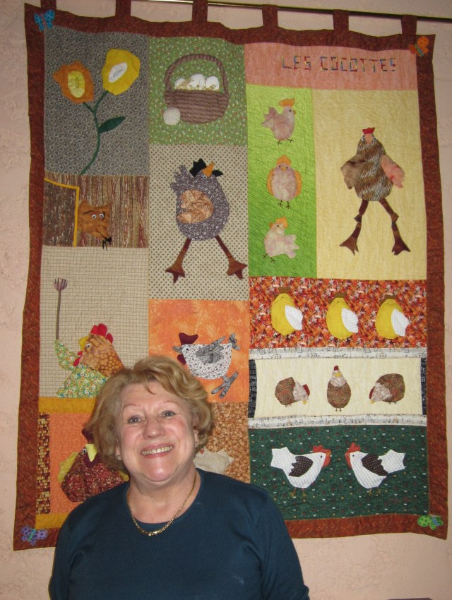 Monday afternoon we visited another quilter in Riez. Mary has been quilting for many years, and has developed her own unique style. She loves bright colours and lets the fabrics spark her imagination. When we arrived, she treated us to quilte a trunk sh.ow…. she has made so many quilts that I asked if she ever sleeps. Here is one she has displayed in her quilting studio……. I especially love the fox peering out at all the chickens.