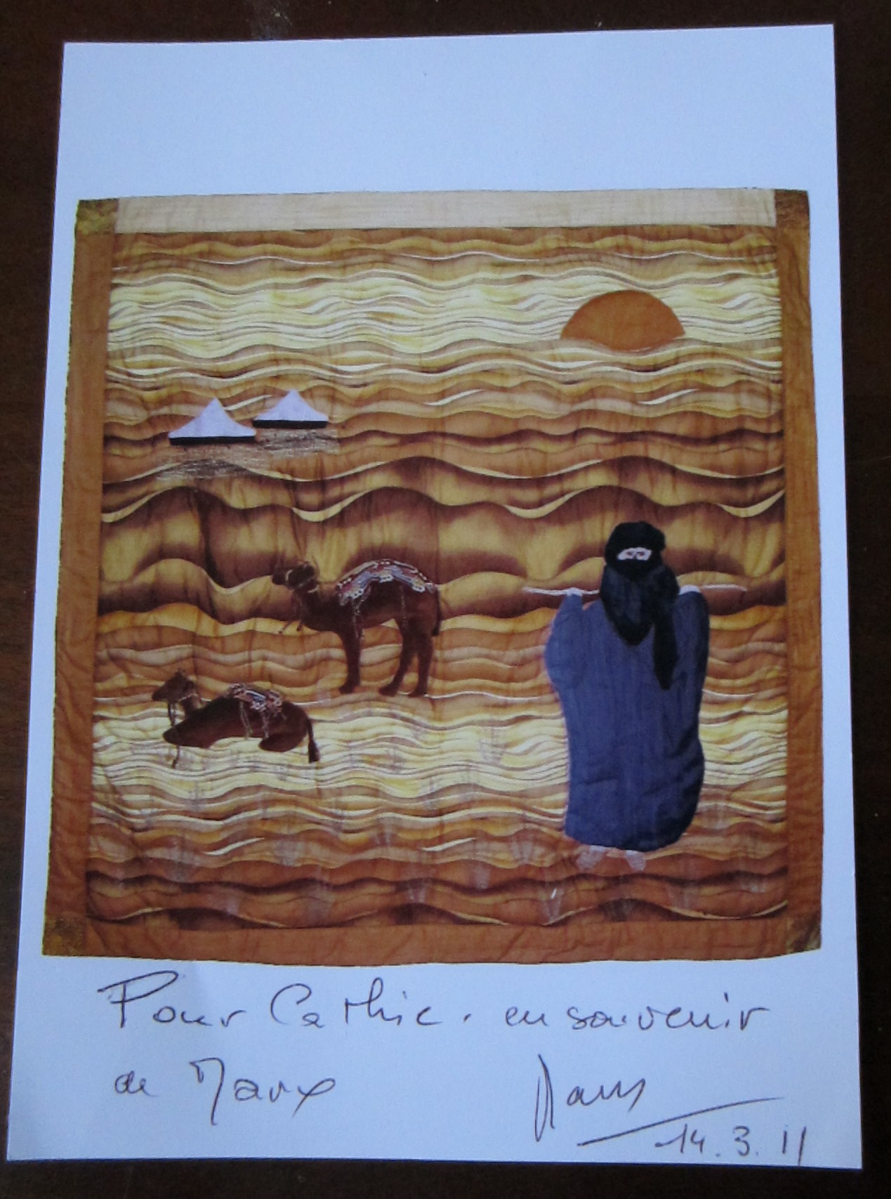 I had my computer with me, so I showed her a sample of my work. We had tea and cake with her and her class, and before we left, she gave me this photo of one of her quilts….. Arabic, suitably, and gratiously signed it for me.