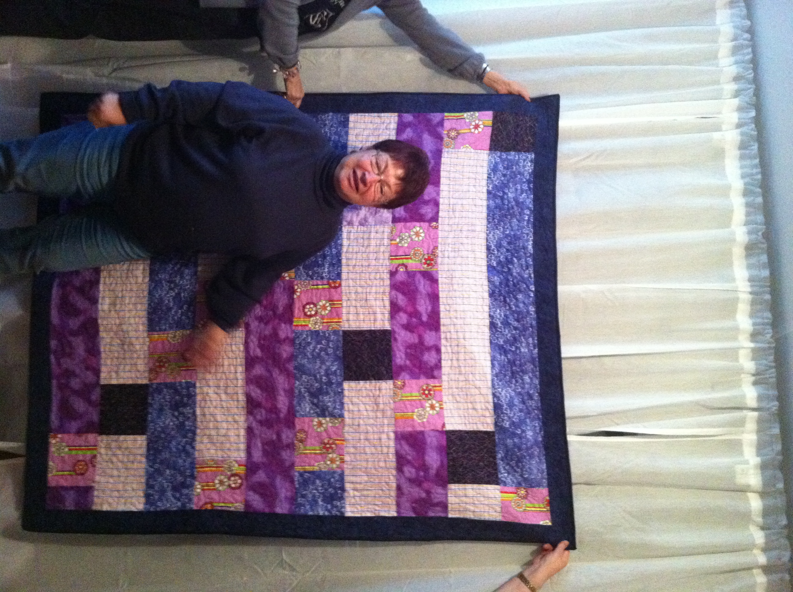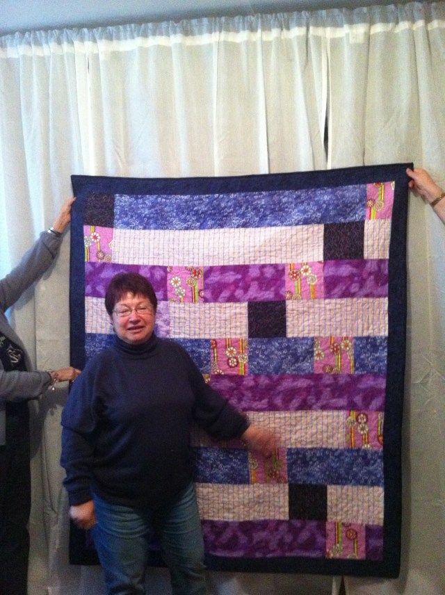 Corinne and some other ladies had made a flannel quilt for one of their quilting friends who has been battling cancer. Together, Corinne and I freemotion quilted it, and gave it to her when the group got together for a lesson in Hawaiian quilting, my way. Paule is a very lovely, bubbly lady, and has a good sense of colour… and purple is her favourite. Here she is with her cuddly purple quilt.