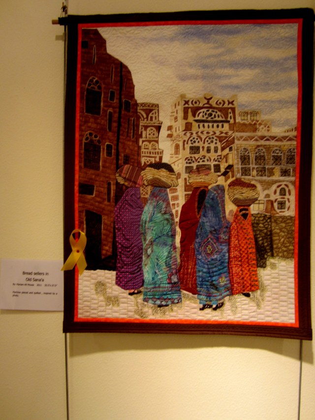Sharon  (my fabric shopping buddy) – 1st place in applique – Paramjeet – another incredible feat of colour, texture, balance and free-motion thread painting.Just look at these birds…… not done by computer.Precision piecing and unerring colour choice in Becky’s Scrappy Stars.Maryam’s Bread Sellers of Sana’a.Najeeba’s “Walk in the Rain” just look at the colours here.Here am I with my applique quilt, which won a Highly Commended.