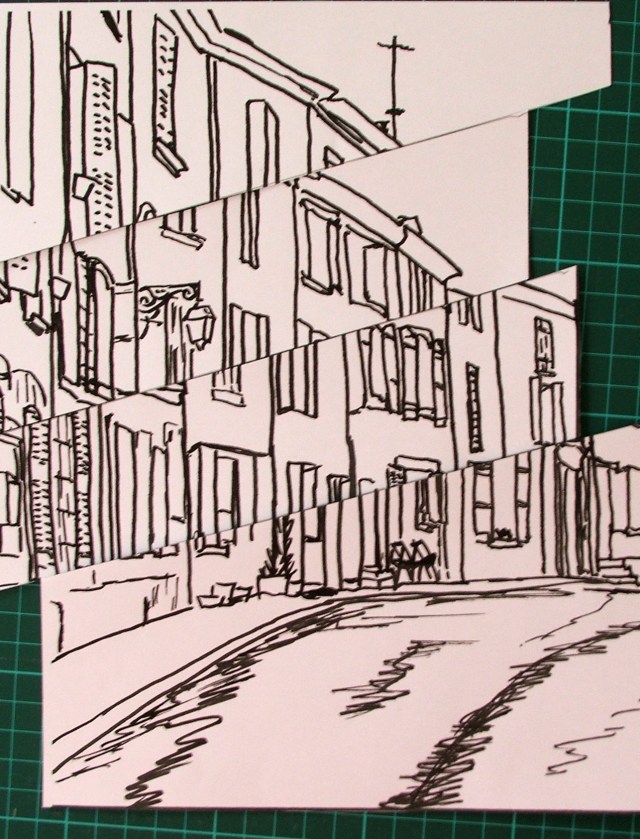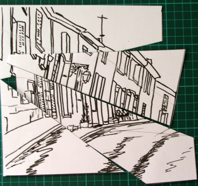 Next, I cut a copy of my drawing into strips and juggled them around to see what happened.  I did two – and am beginning to see the possibilities for leaving pieces out and bending the lines to get a different feeling. Next, I will try to crop out areas with interesting lines and shapes, and see what I can come up with.