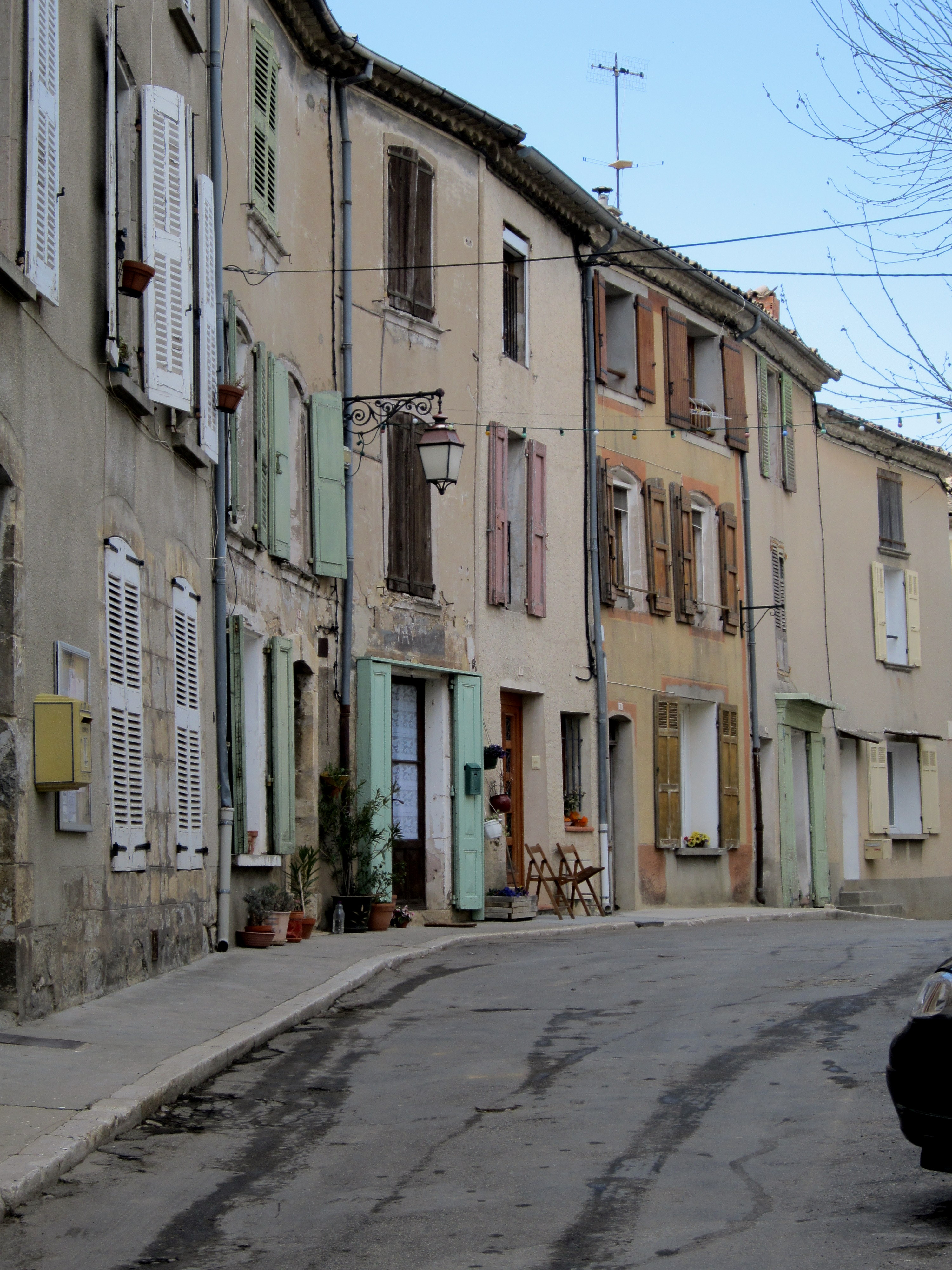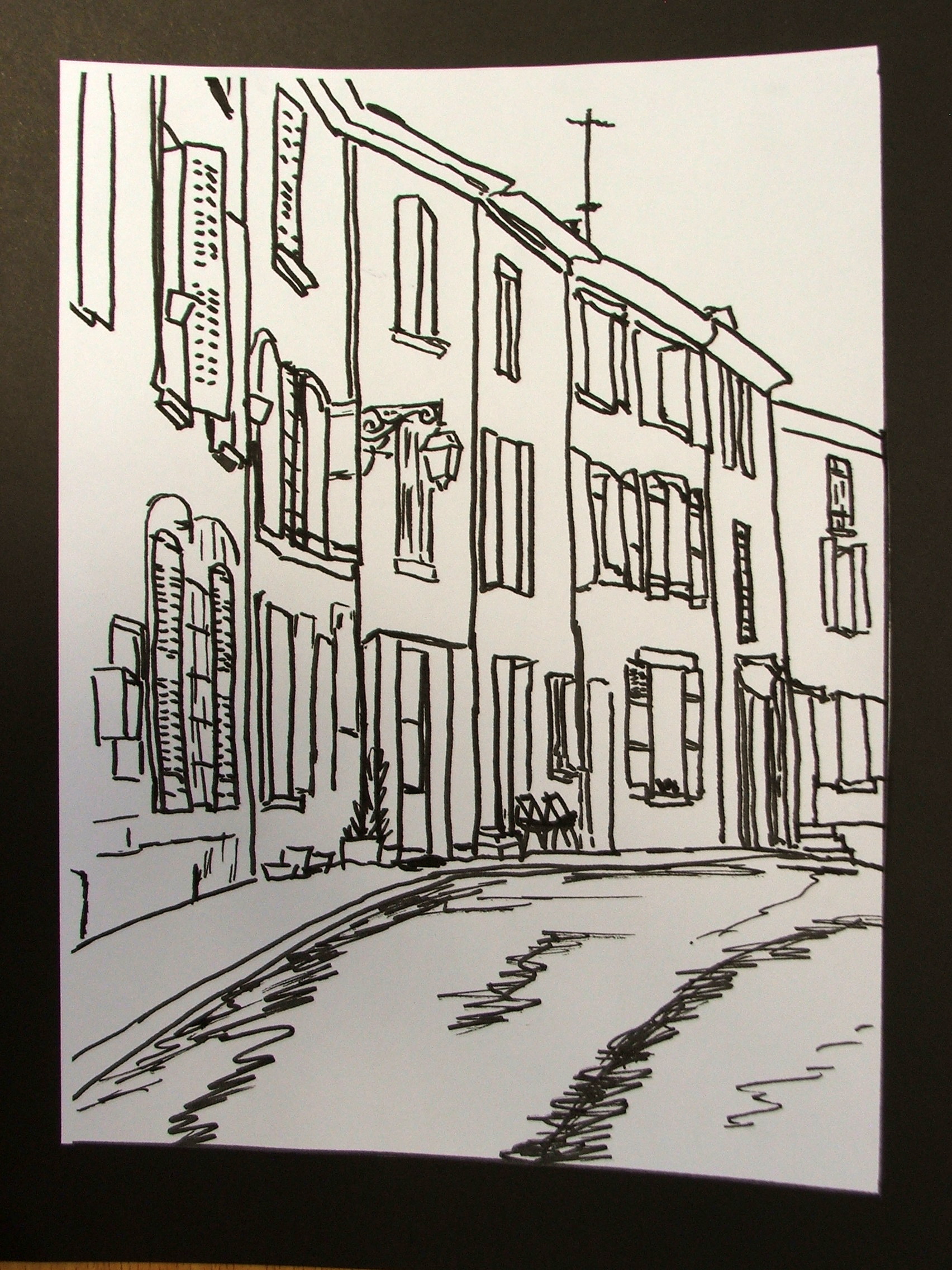 Now, showered and plants watered, I am ready to start the quilting part of my day.  I’m taking a class through Quilt University entitled “Inspired to Design” with Elizabeth Barton.  I’m behind, but working on it.  We are beginning with a photo, mine – a street in Riez, France, making a sketch of it, and then through various exercises, manipulating it or parts of it to trigger new ideas and designs.  Here is my photo, and copy of it…… there is too much detail in my copy, but I love all the shutters, and really didn’t know what to leave out. Now that I am beginning to to play with it, I’m seeing what might be eliminated.