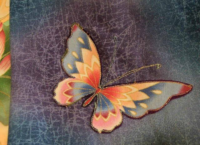 And I am embroidering butterflies on Isabelle’s quilt – here is the first one.  I just used my applique foot on it, but will change to the free-motion foot so I can go all around without having to turn the quilt.  I am using a fine metallic thread with a few other colours besides gold – it really works well.  I will go around one more time, I think, to define the edges, and also to secure them better.