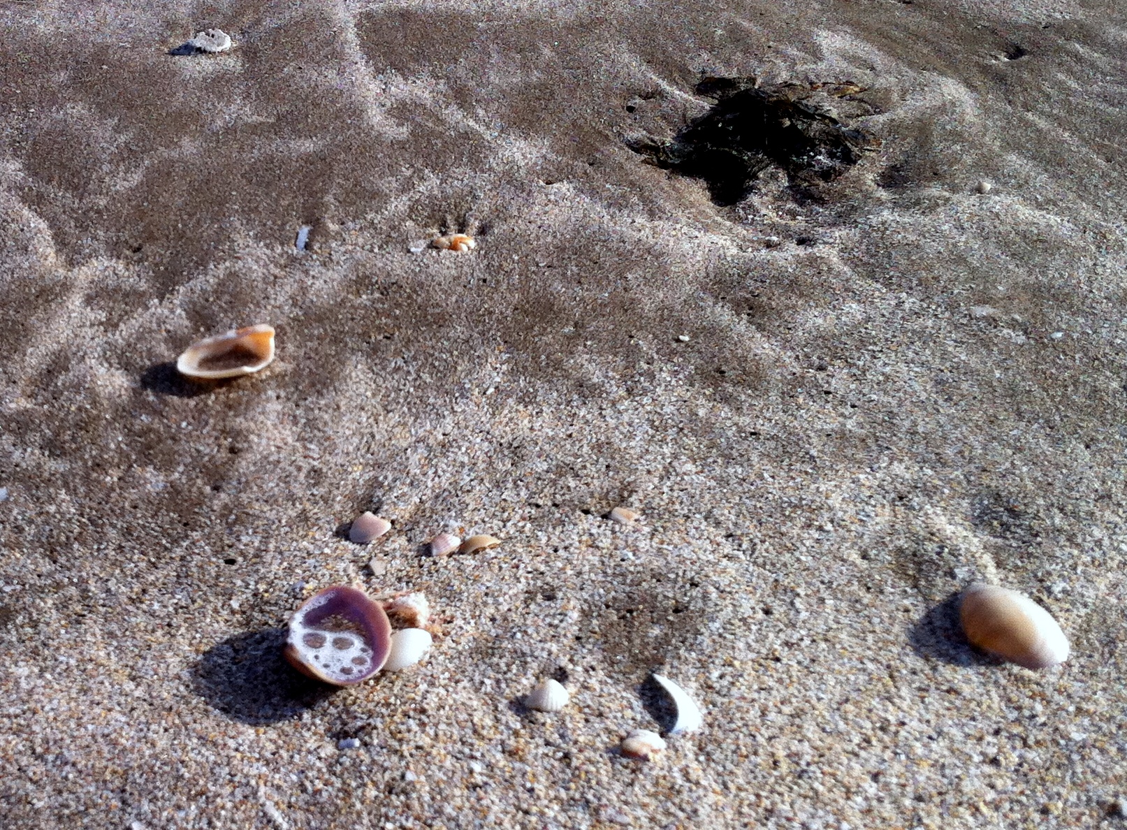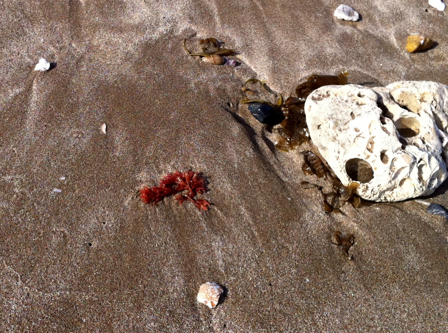 There was a lot of seaweed on the beach this morning – I wish I knew what is happening in the water to bring in sea weed, or lots of shells, or pile sand up or wash it back into the sea. Not many shells, although I was stopped by this tiny one sitting full of water… don’t think I’ve seen that before.