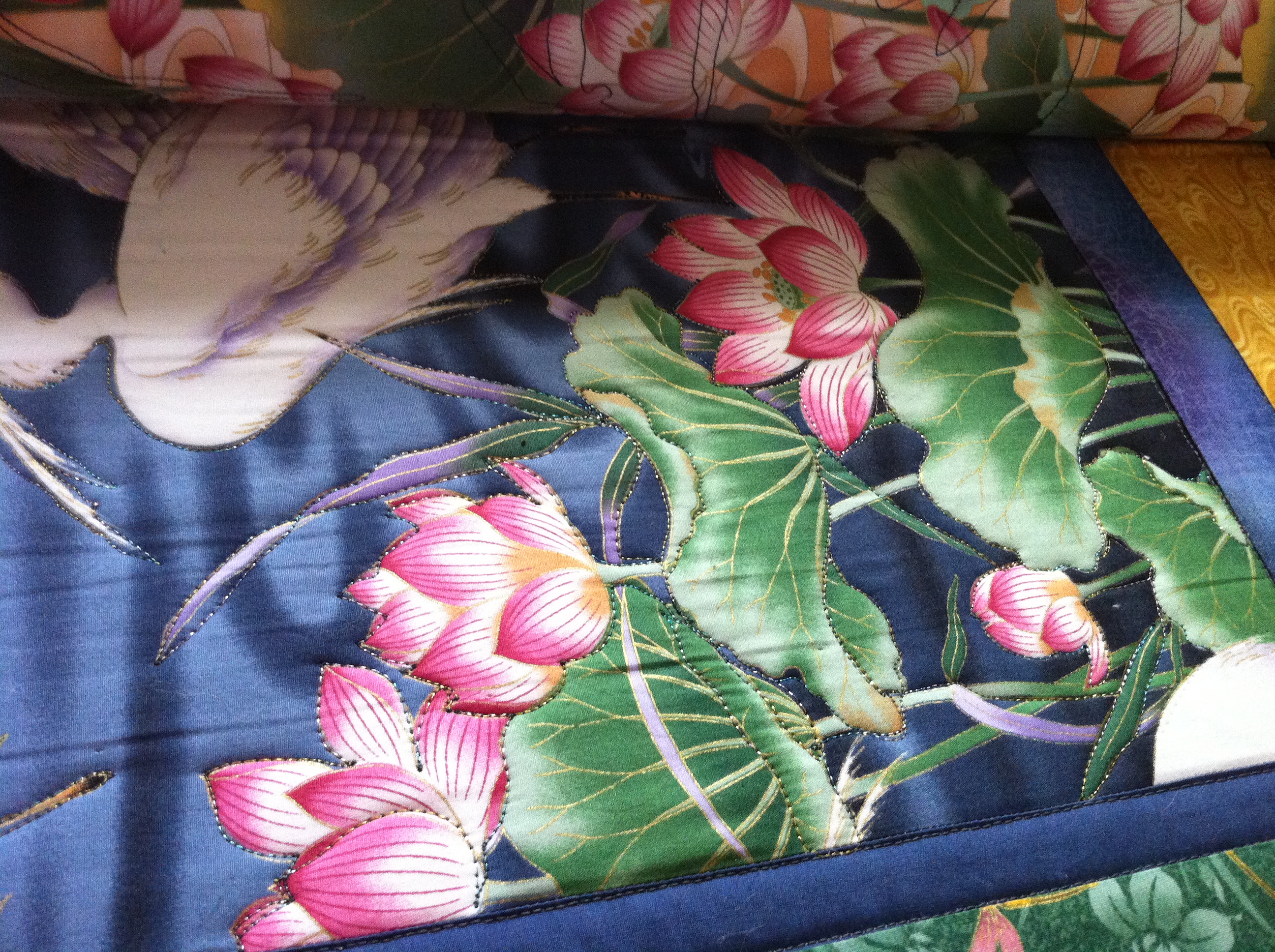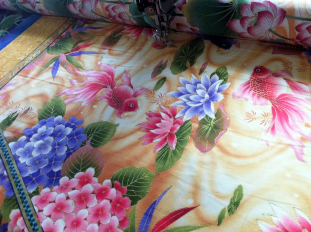 I’m outlining the flowers and fish, and then will do some water-swirl meandering. There is a bit of extra fullness here that needs to be quilted out, as the small sashings in the area were on the bias.