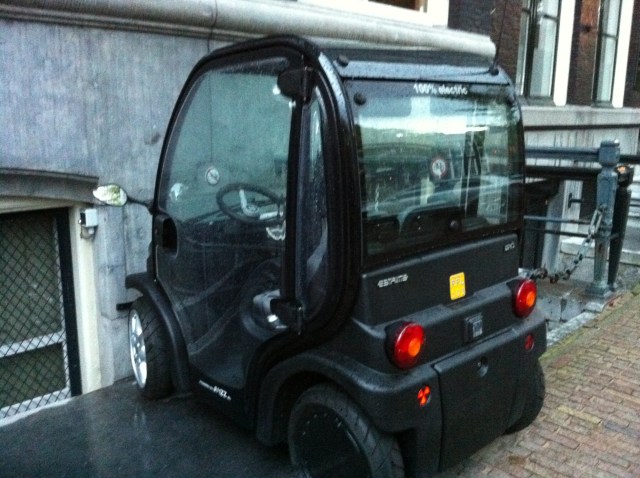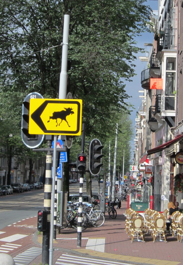 This sign was not far from our hotel……. and I’d love someone to tell me where they think the moose is coming from.This little car was only one of many we saw parked along the streets and canals.  In a city where there are more bicycles than people, small is best.Amsterdamers ride bikes all over – with small children on board, or in carts on the front of the cycle, and with umbrellas in the rain.  Near the Central train station, there is a 4-story bike parkade.