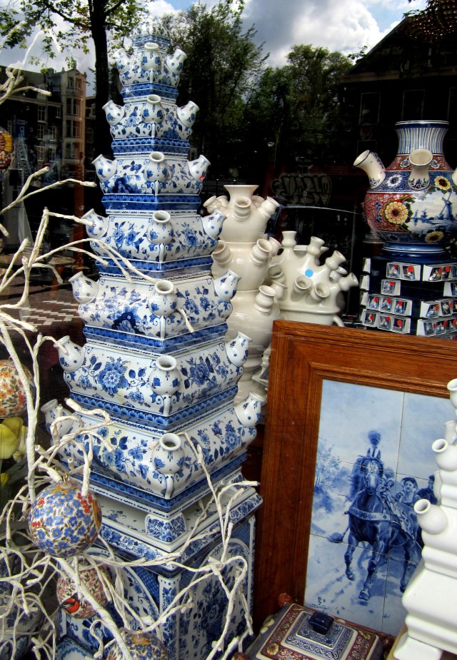Another museum that we enjoyed was the Tulip Museum which showed the different types of tulips, where they came from, and how they were and are grown.  It was Turkey that really prompted the importance and the spread of tulips.  These interesting towers and pots are for displaying tulips – one in each of the little openings on the corners. This was a shop of all Delft products – through the window so the trees and sky are a reflection.I’ll try to get to the museums and scenery tomorrow.  Hope these photos remind you of how much you like Amsterdam if you’ve been, or make you want to visit if you haven’t yet.