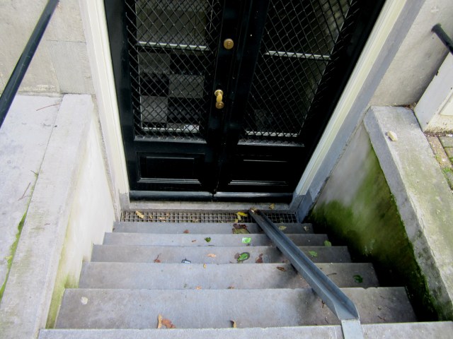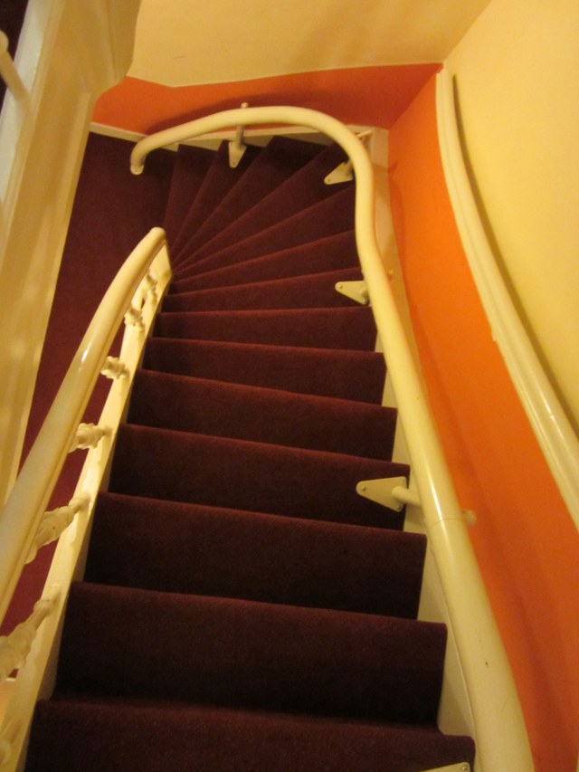 Going through my photos of our two days in Amsterdam, and it’s so hard to weed them out!  We loved it there, in spite of the rain.  I’d been fighting a cold for a week, so the first evening, we had to find me a scarf to wrap around my throat. Although it says “Amsterdam” all over it, the colours are great, and it doesn’t look tacky or touristy… at least I don’t think so.Most of these photos are of unrelated things – just bits and pieces that we found interesting. First – our hotel, which is a 17th century canal house – here is a shot of the stairs up to our room.Fortunately, they have good hand rails, and also an electric seat that you can ride up and down if you can’t walk it. And most of the basements are accessed from the outside only – notice the ramp for taking your bicycle down with you.