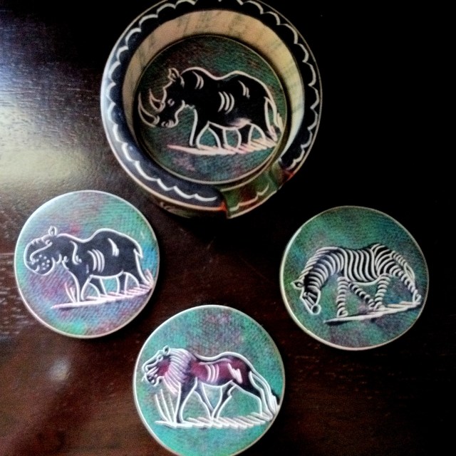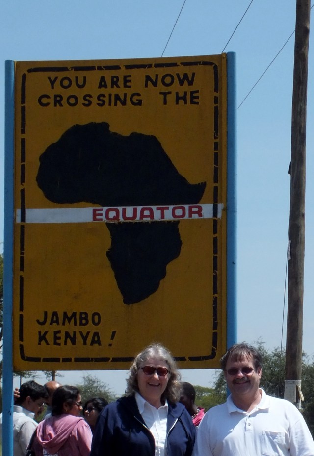 It was here that we spotted our first wildlife –  spider monkeys on the branches of a nearby tree.We drove along the bottom of the valley now, past a series of lakes, Magadi, Elmenteita, Bogoria, Nakuru and Naivashu, many of which have a high mineral content as they have no outlet to the sea.We stopped at the Equator – suitably marked by a huge sign and a demonstration of how water flows in different directions on each side of the equator.  And shops……… the lovely lady who took our photo beside the sign then had us hooked to buy some of her wares.  We bought some coasters, and a really neat stone box-shaped like Africa, where the key piece to remove is Kenya. I paid way too much, but it is still really nice.