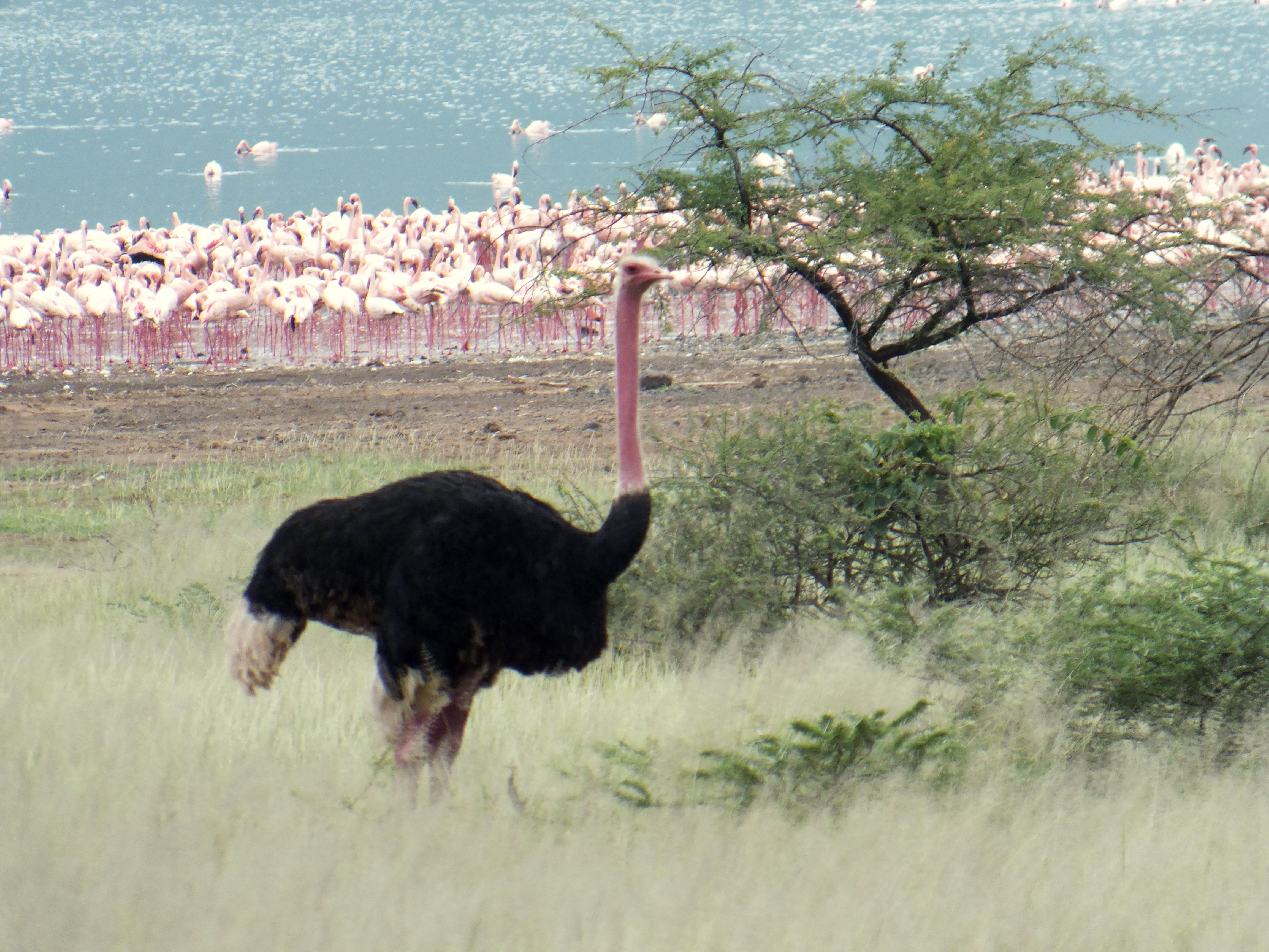 We went back to the vans, and proceeded around the lake, passing this male ostrich.