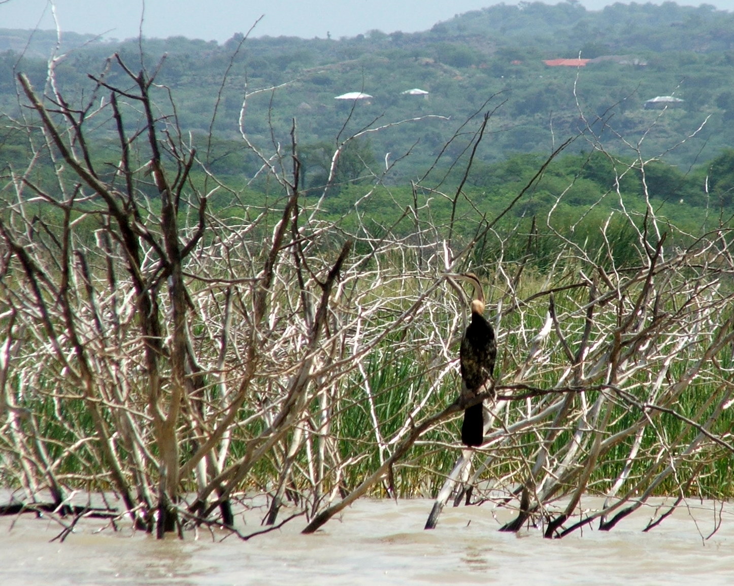 After lunch, the first thing we did at Lake Baringo was go for a boat ride on the lake. The lake water is the colour of mud – all the water seems to be as there is so much erosion of the topsoil because of the goats and cattle grazing. I had my new camera instead of my binoculars – 30X zoom instead of 10X – but as we got going I was a bit worried we’d tip and it would be gone. Silly me – we were quite safe -once the seven of us jostled for position and got settled. David brought his camera as well, and a lot of the shots in this post are his.