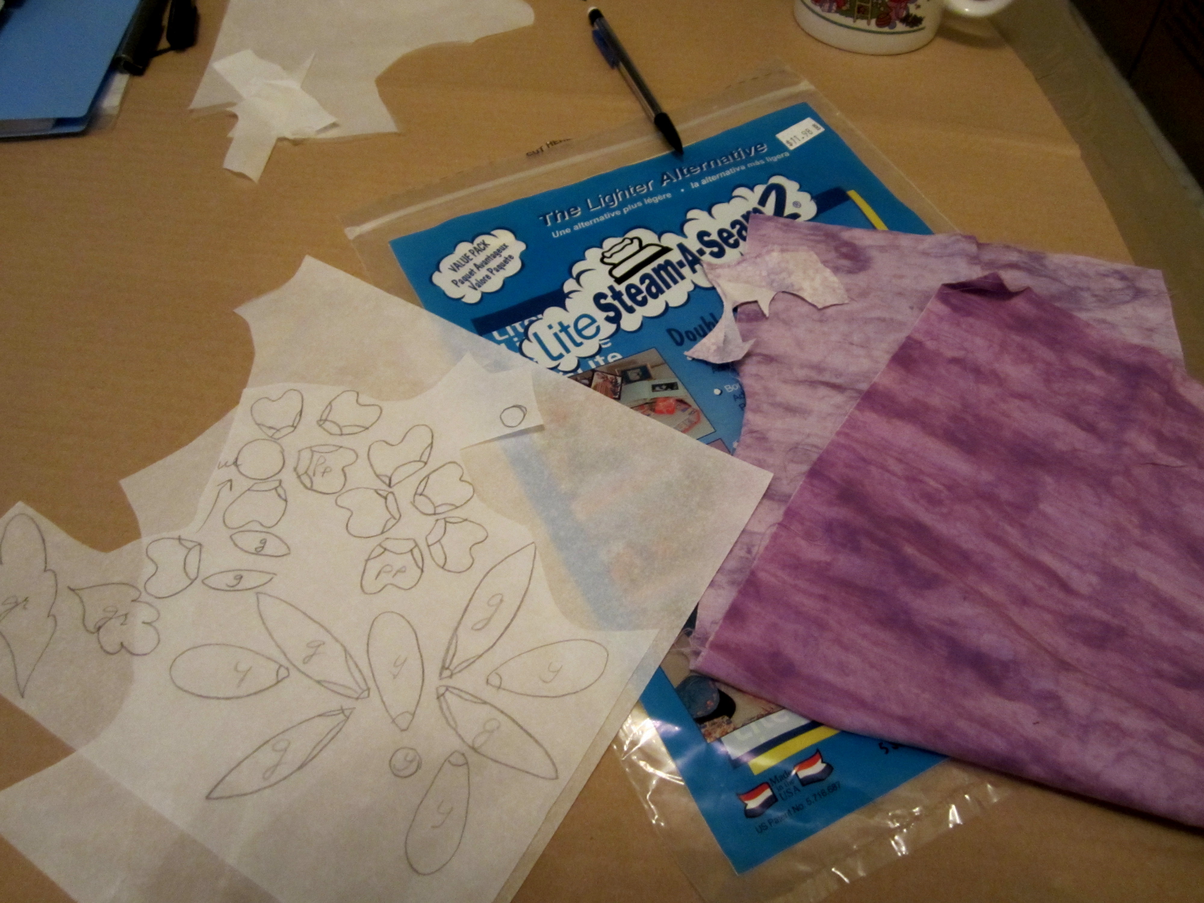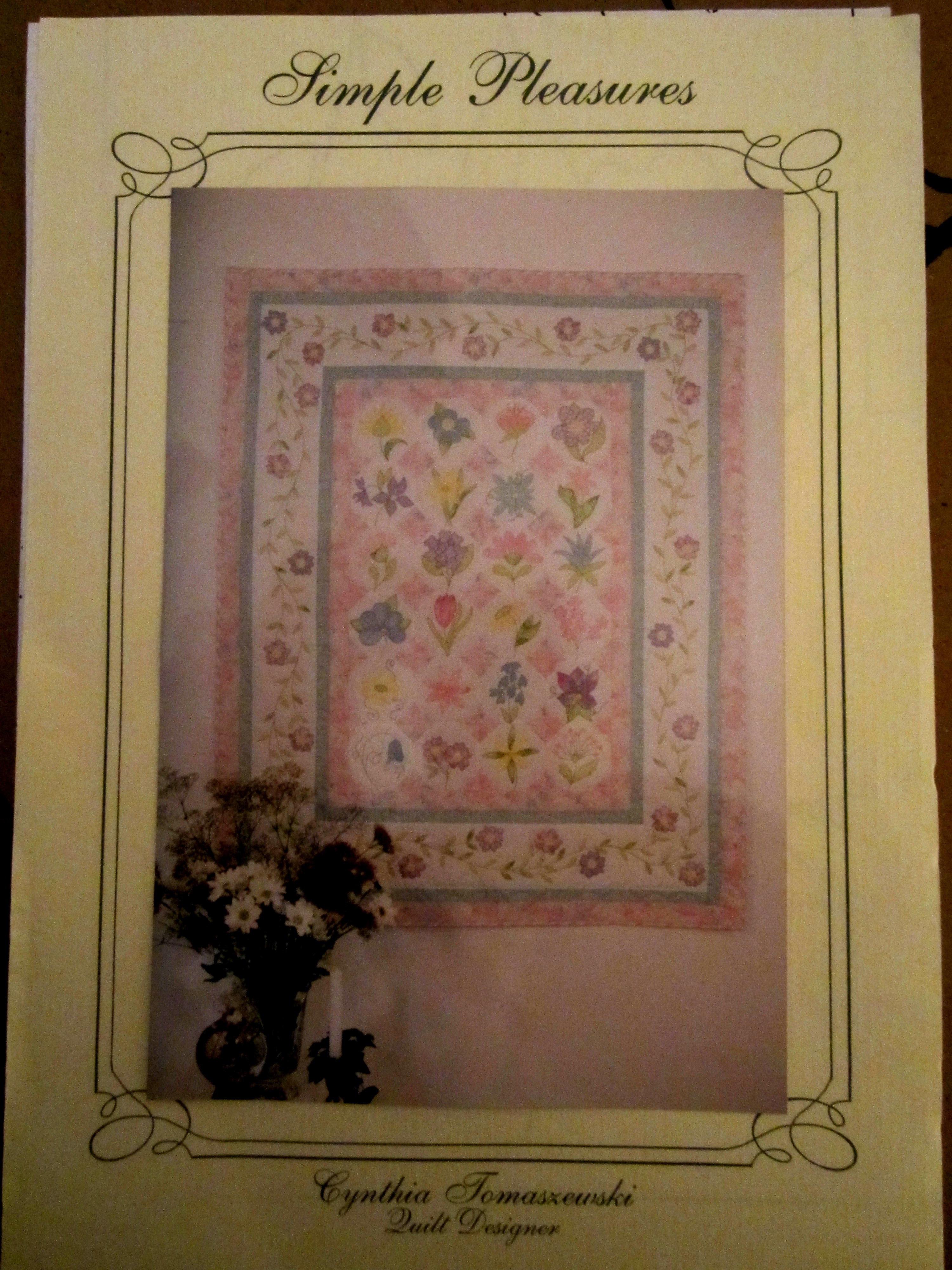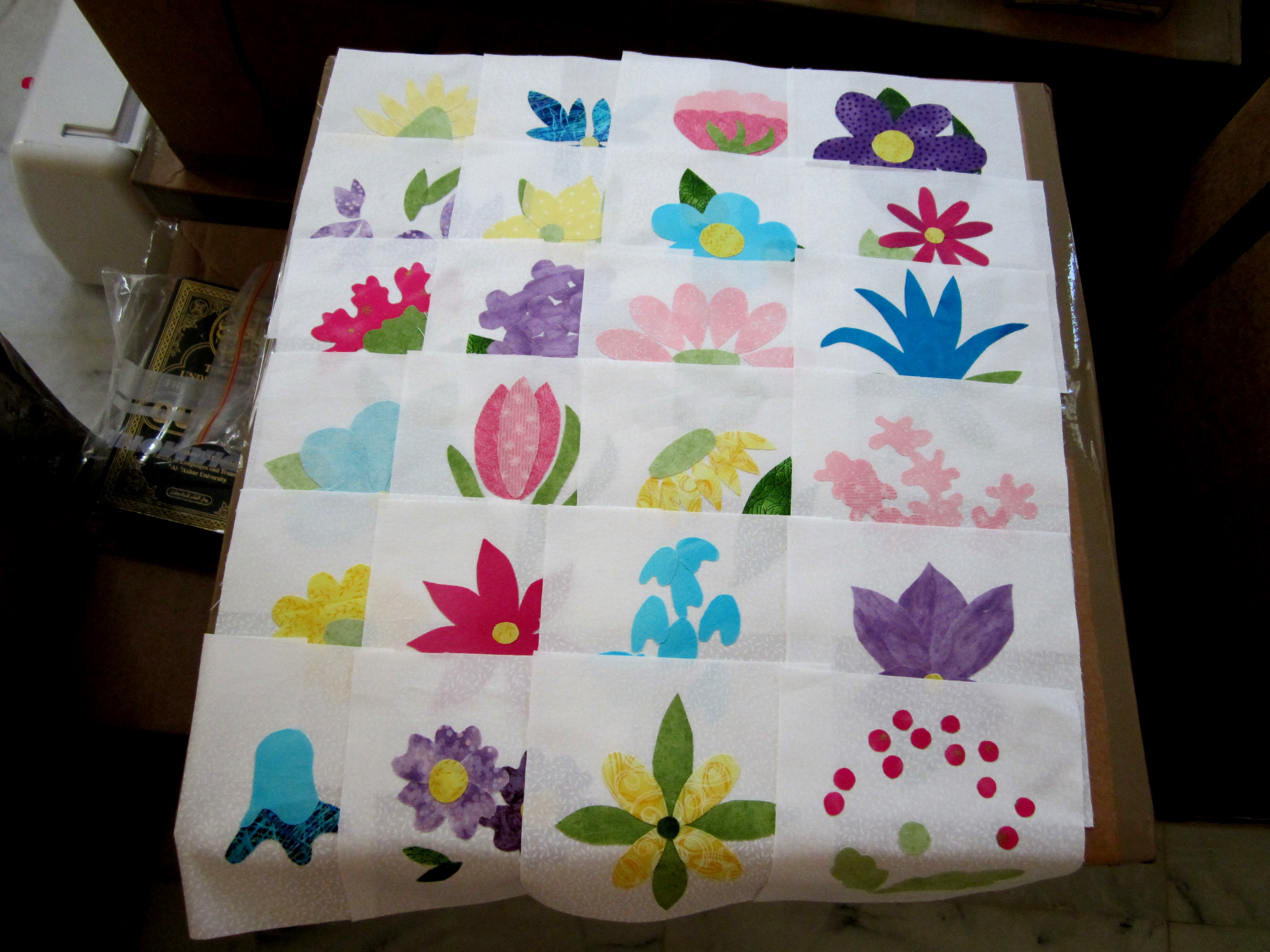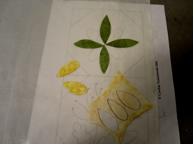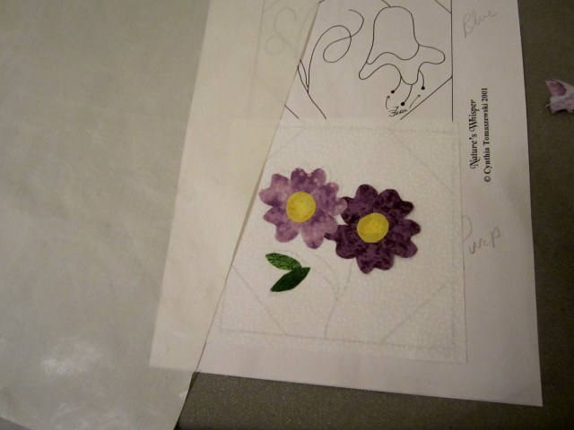 The past couple of days, I’ve been working on the baby quilt for my new granddaughter, who should arrive the beginning of December.  I’m doing fused applique as i want it to be strong enough to handle hundreds of washings.  Kind of slow going, with all the little pieces of the flowers.  A few photos of the patternthe fabics (or some of them)and the proceedings.After having to redo 5 of the 24 blocks because I had the background fabric upside down, I am now ready for the next step – sewing all the pieces in place.  After that, I will use rayon or silk thread in my machine to add all the stems and vines etc., and then I can start to sew the quilt top together.