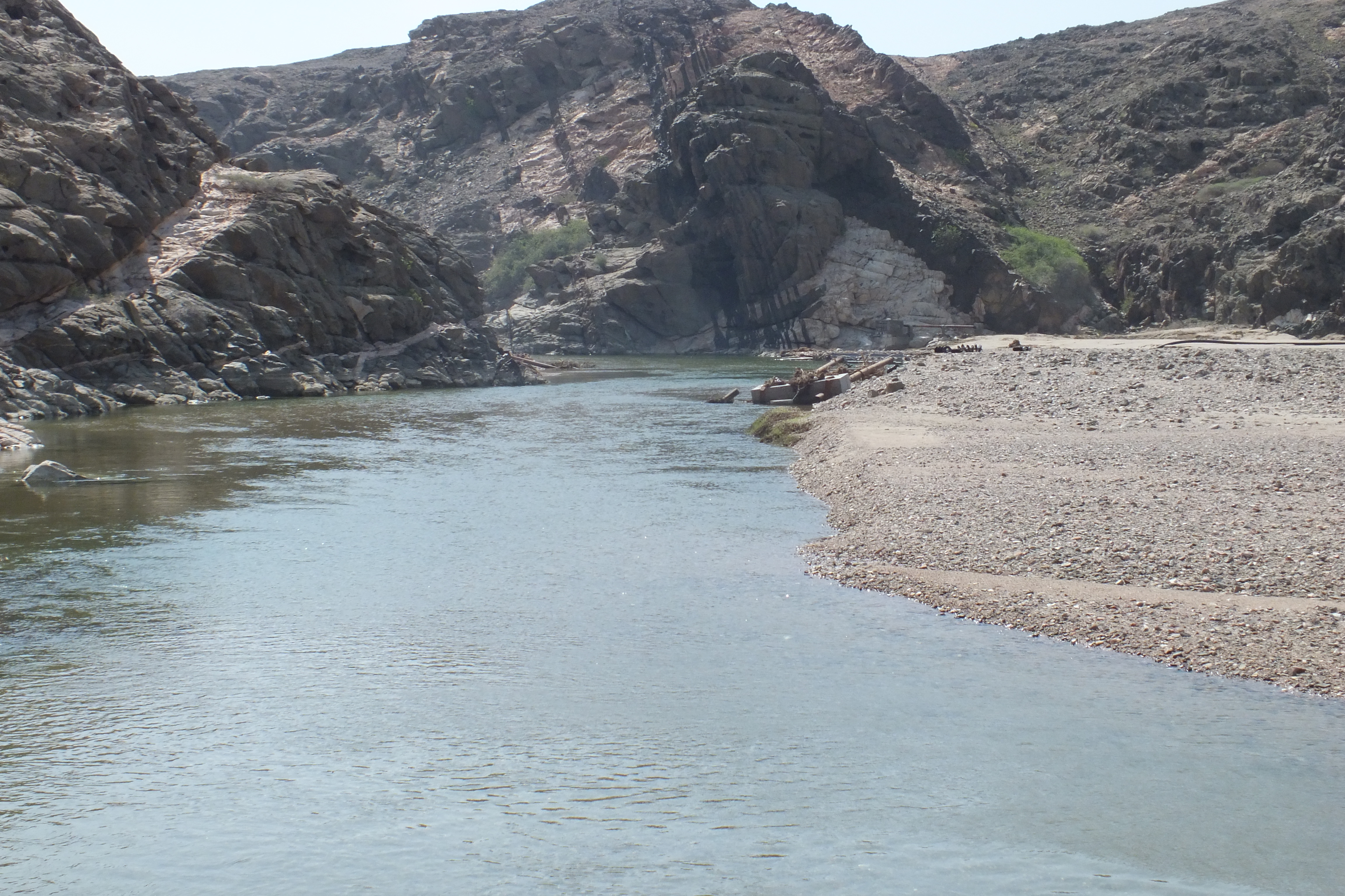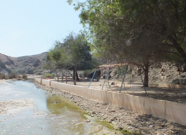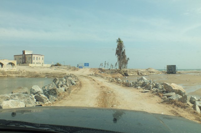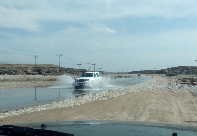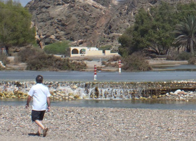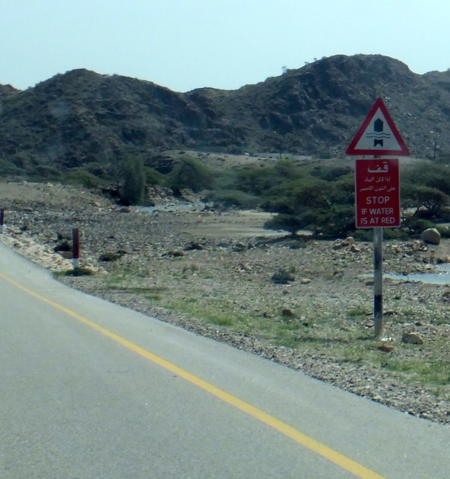 Sadah is about 40 kilometers from Mirbat. first, you climb up on a plateau, driving down through wadis, or dry(??) riverbeds along the way. There had been rain recently in the mountains, so there was often water running over the pavement in the low spots. The British devised a way to tell if the water is too deep to drive through – it doesn’t have to be very deep sometimes for the current to wash a vehicle sideways. Anyway, they put white cement posts along the side of the road with the danger level painted red.