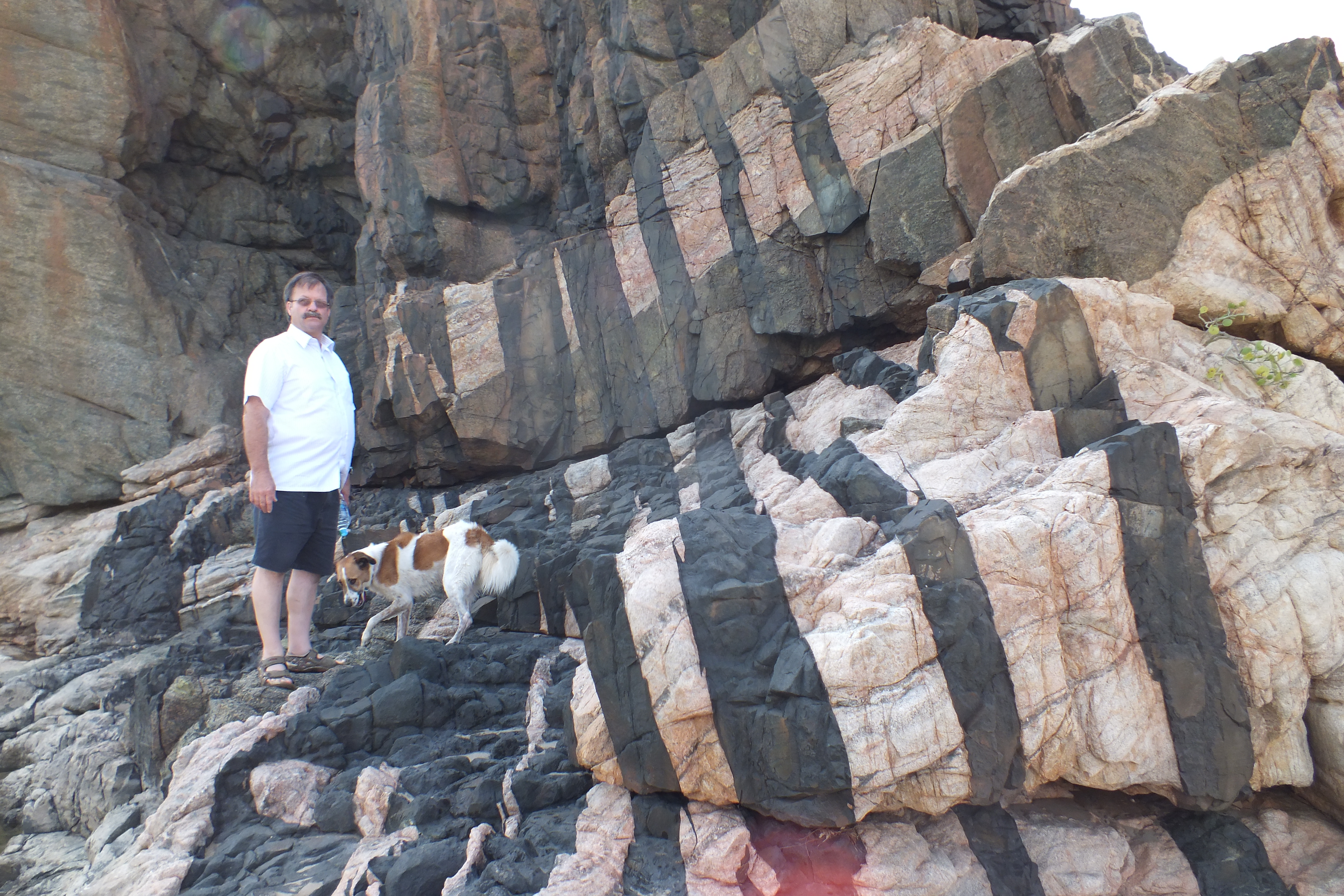 and the waves were tall and came crashing in. The rock formations were quite interesting – like this big rock with bisecting seams.