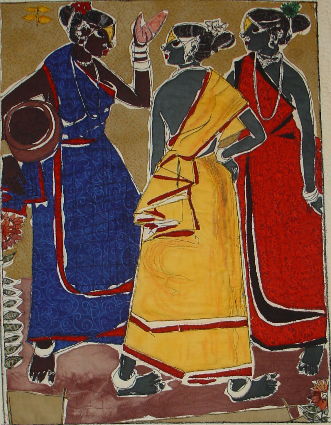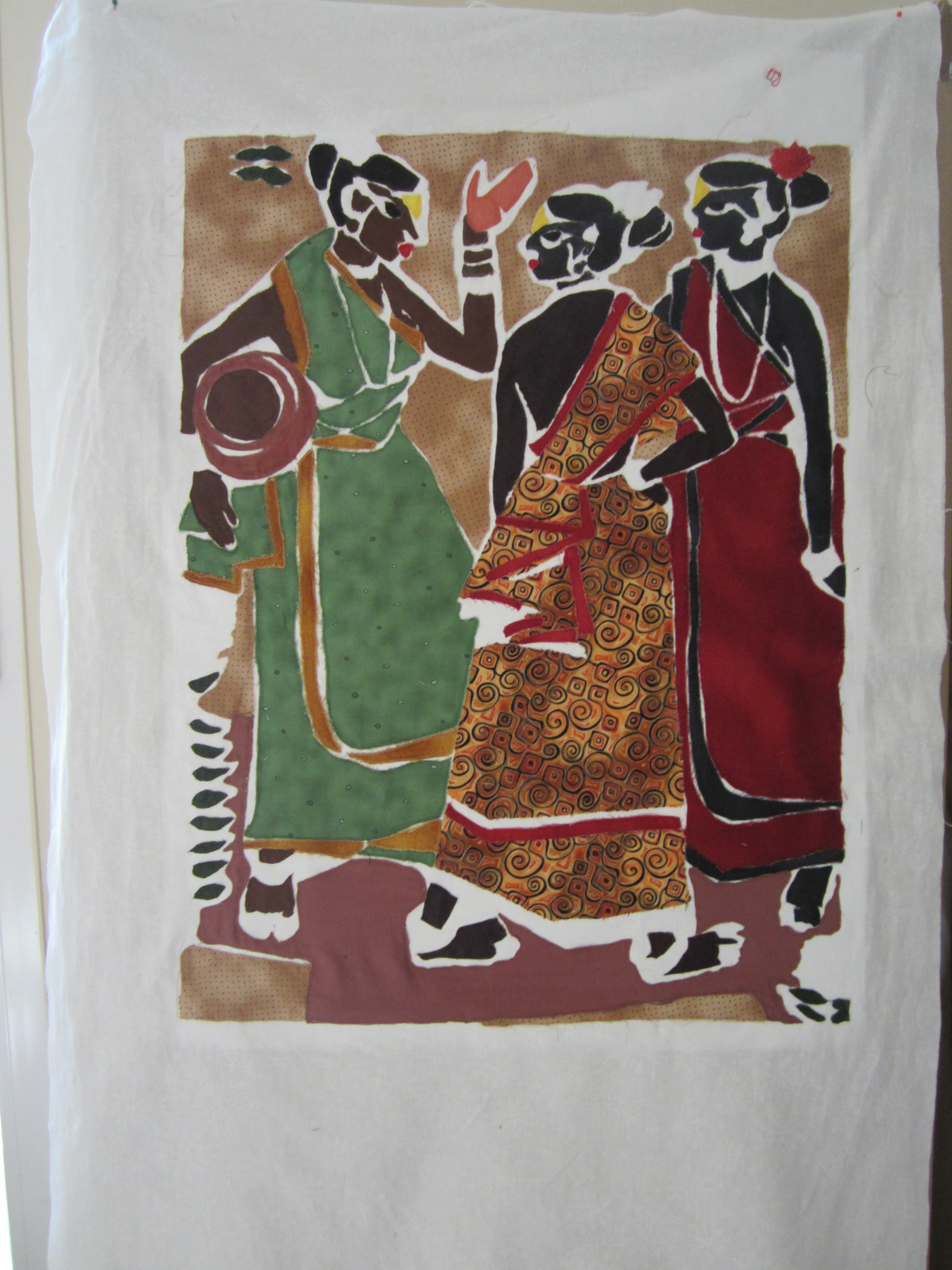 We have been copying a quilt of hers – an adaptation of a painting by an Indian painter. This is mine to date – still a few bits of colour to add and then all the black lines and quilting.
