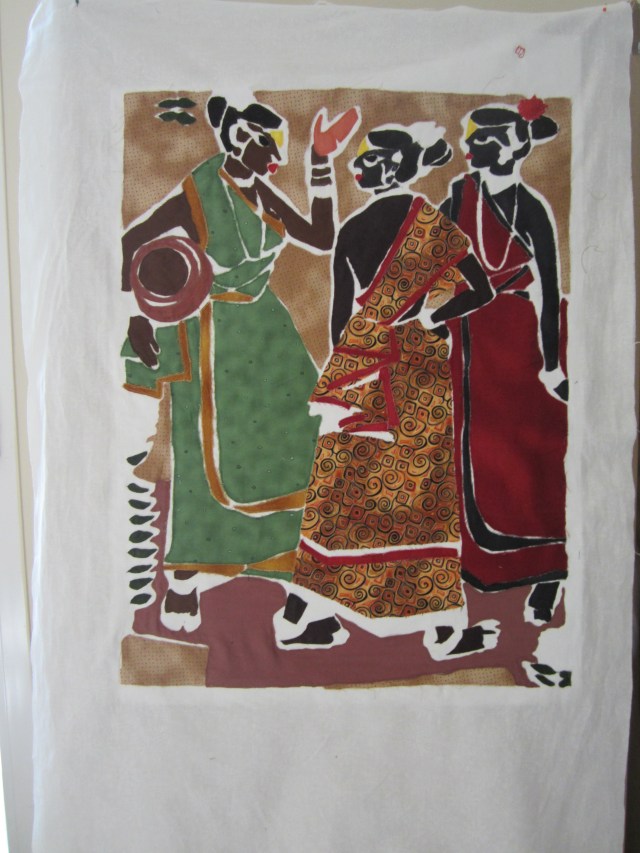 We can all see ways that we will be able to use this technique to advantage on our own projects.  I’m thinking it will work well for my series on French streets and shutters.  Next week, we plan to give fabric dying a try – Paramjeet has done a lot of this, and has some new dyes to try out.  But this doesn’t let us off the hook for carrying on with our project of three Indian ladies.