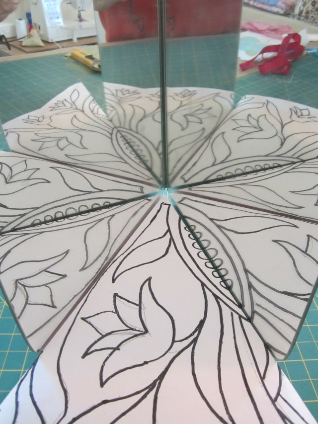 Here is what I have so far. I folded the paper in eighths, and drew on one side.  By using mirrors, I can see what it will be like – sort of, because my mirrors are too small to show the whole pattern. I’m trying to put some colours together – I’ll draw the pattern on all parts of the paper, and then try out different colours schemes on each eighth with my pencil crayons and see what I like best.