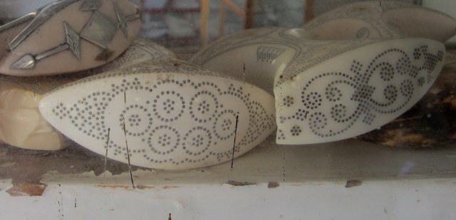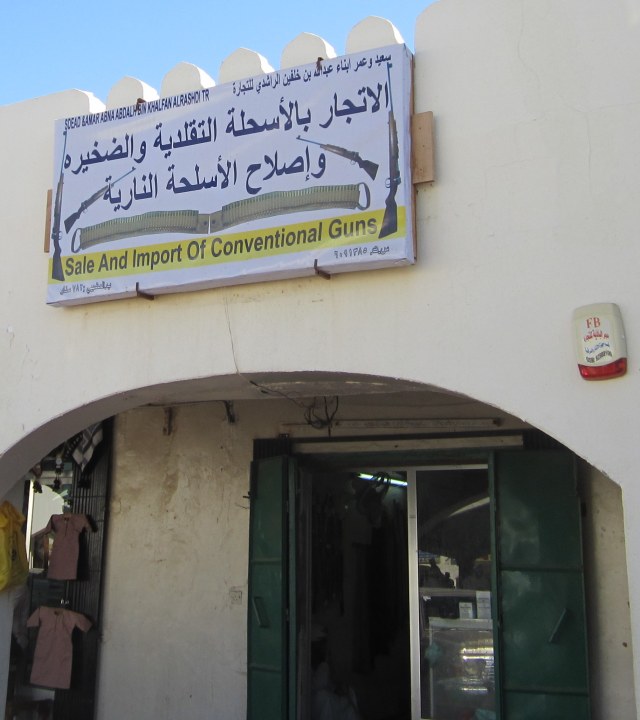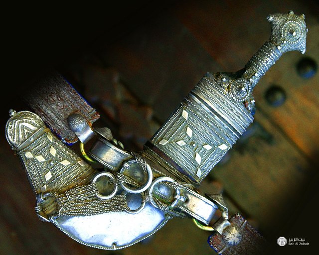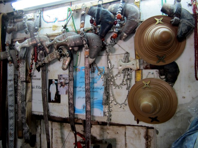 These are the knives with curved blades and the curved scabbard that you see on belts of well-dress Omanis and Yemenis. They used to be worn most of the time, but now, they are just for formal occasions. (By the way, those small round things are shields made of rhinoceros hide.) If you know what to look for, you can tell the area where the knife was made and even for which family by the handle and the decoration on the scabbard.