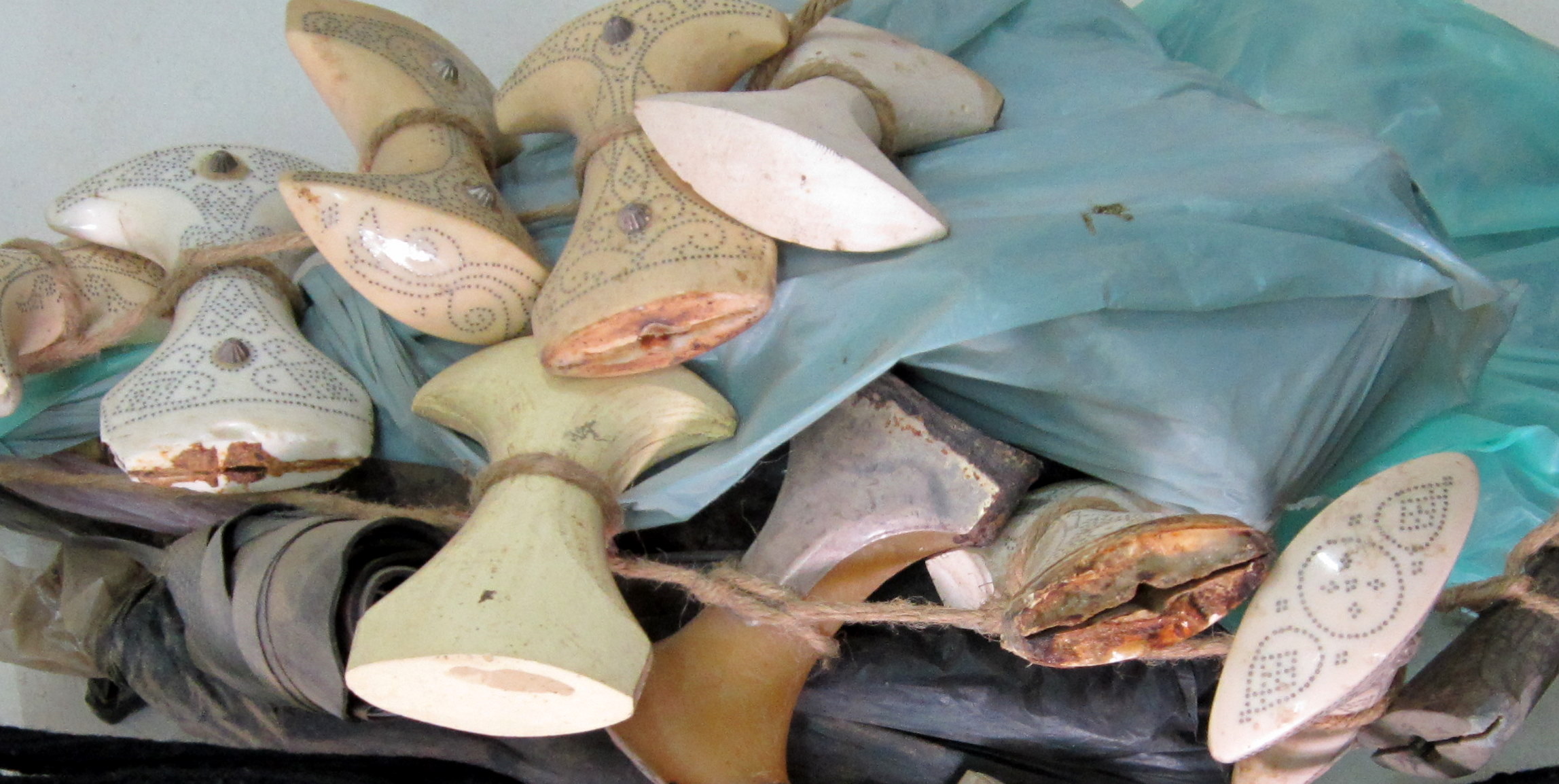 These are handles – they are mainly made from sandal wood or bone, although some are horn or ivory. The design is made by tapping small silver nails into the handle.