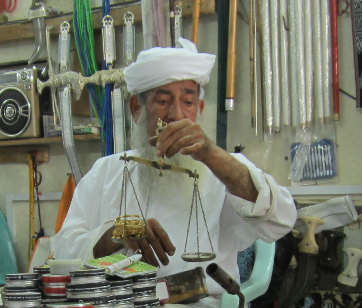 This is his son, Omar, weighing some gold that a gentleman had come in to buy.