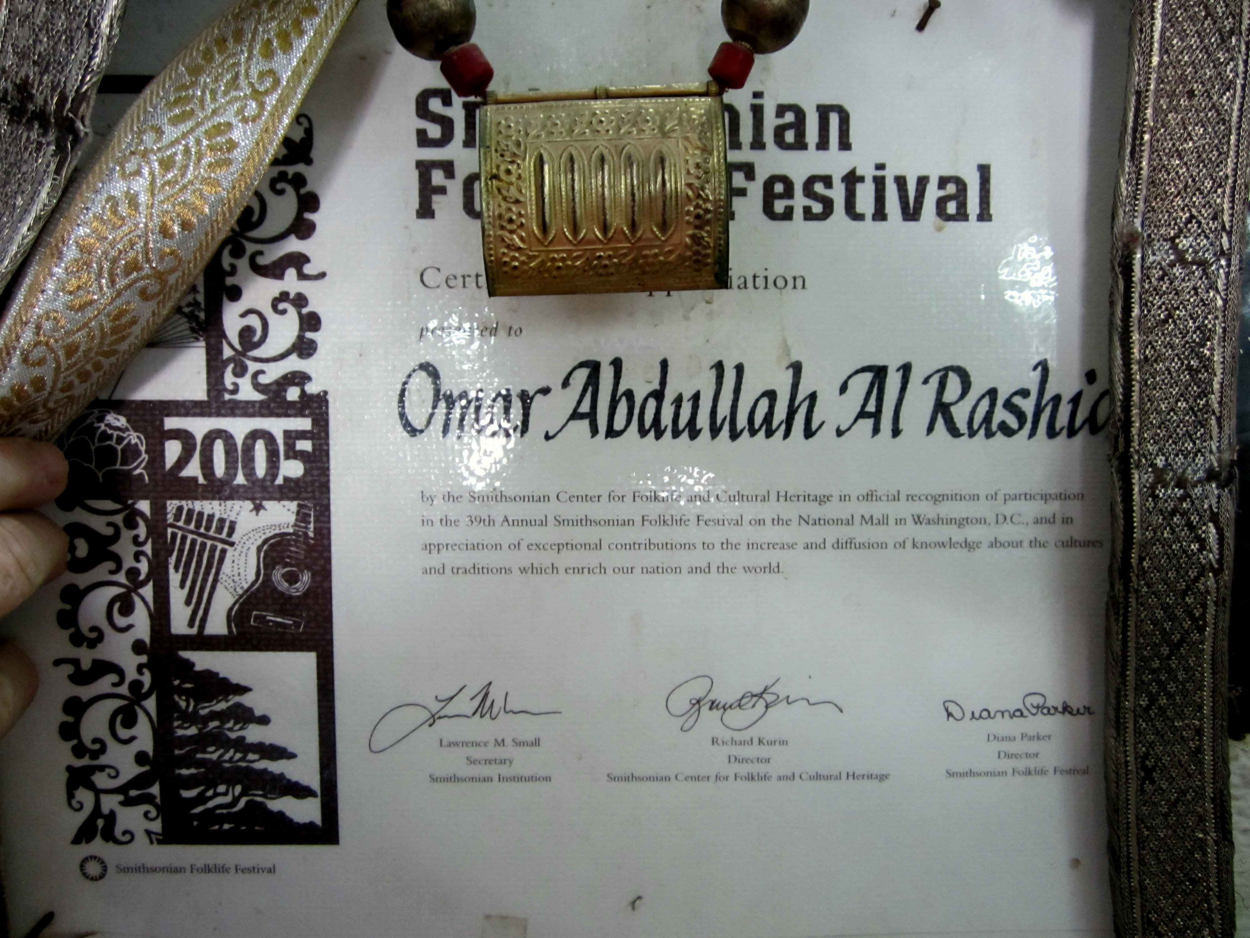He is apparently very knowledgeable about khanjars, as he received this award from the Smithsonian Folklife Festival in 2005.
