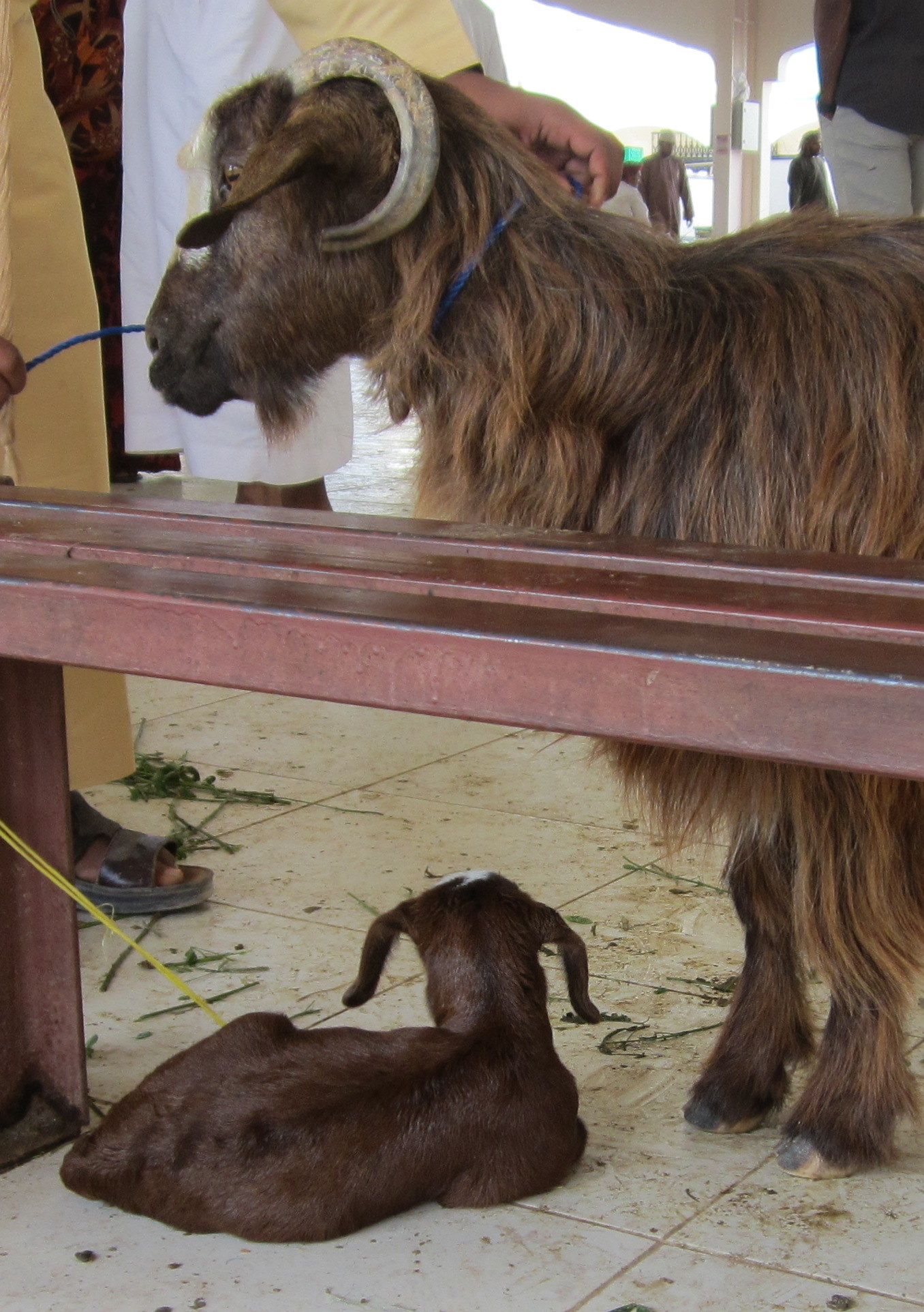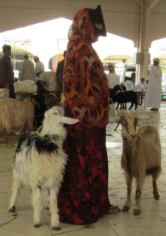 Take two – the following weekend – Dec. 29, we headed out to Sinaw again – for the Thursday market.  This is the day when the Bedouin come in to town to sell their camels, cattle, sheep and goats, and stock up on the items they need.  When we arrived about 10 am, the streets were bumper-to-bumper with cars and small pick-up trucks, and the sidewalks thronging with people.  We quickly found a place to park, and , hurrying through the housewares and clothing souq, we headed to the place where they sell the animals.  We were too late!