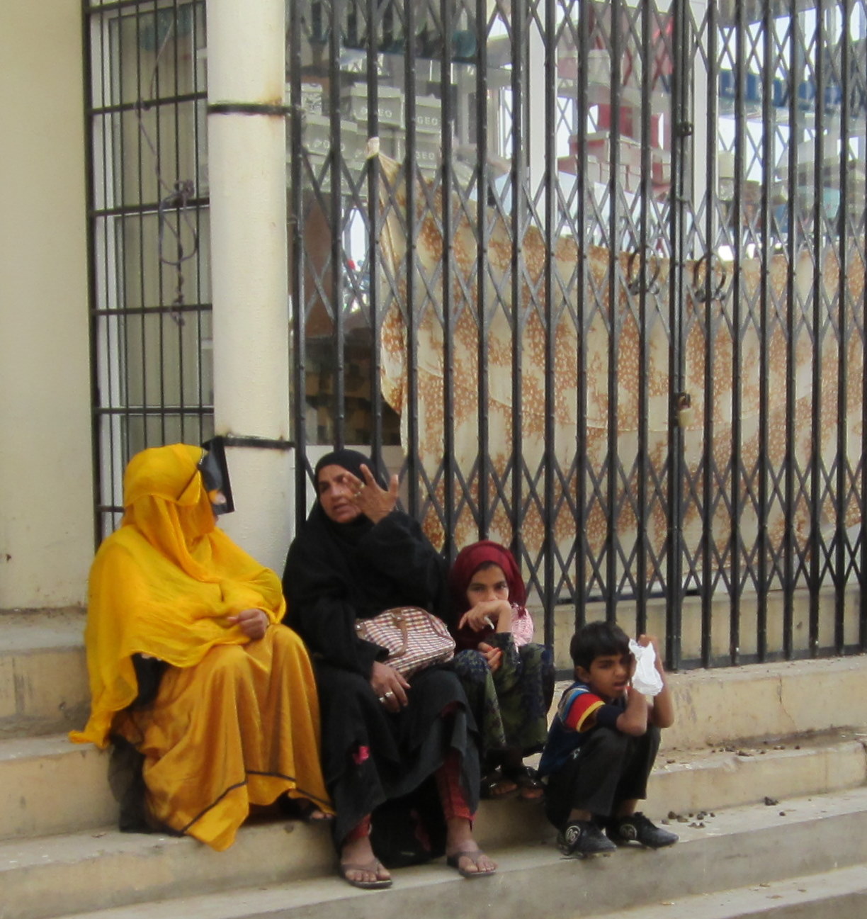 Unlike the city Muslims, the Bedouin ladies wear wonderfully colourful robes and scarves, and most wear a burqa or face veil which covers the forehead, nose and mouth.  They used to all be made of cotton, dyed with indigo and beaten to a gold or bronze colour.  As indigo doesn’t absorb into the fibers, it is beaten to fix it, and the colour changes with exposure to sunlight.  They are mostly made of black fabric now, and I’m not sure what the piece sticking out between the eyes is for – it really cuts down your range of vision.