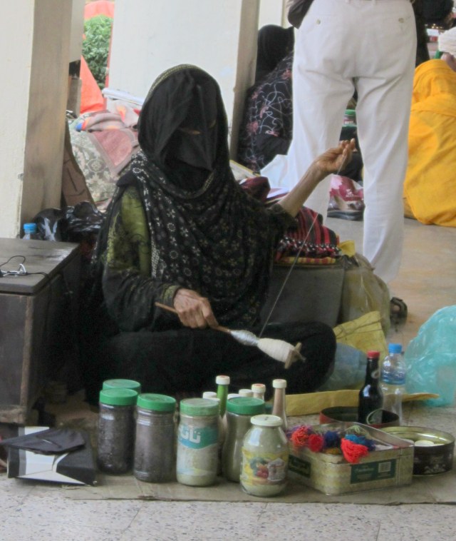 Alice and I each bought one from this little Bedouin lady who was spinning wool with a drop spindle.  There were several ladies watching as we tried them on – they were smiling as if they thought it was neat that we were doing that.  Here is Alice in hers – I’m sure I looked just as funny – but I don’t have the photo yet, so I don’t have to own up to it. I’m sure I looked beautiful. (haha)