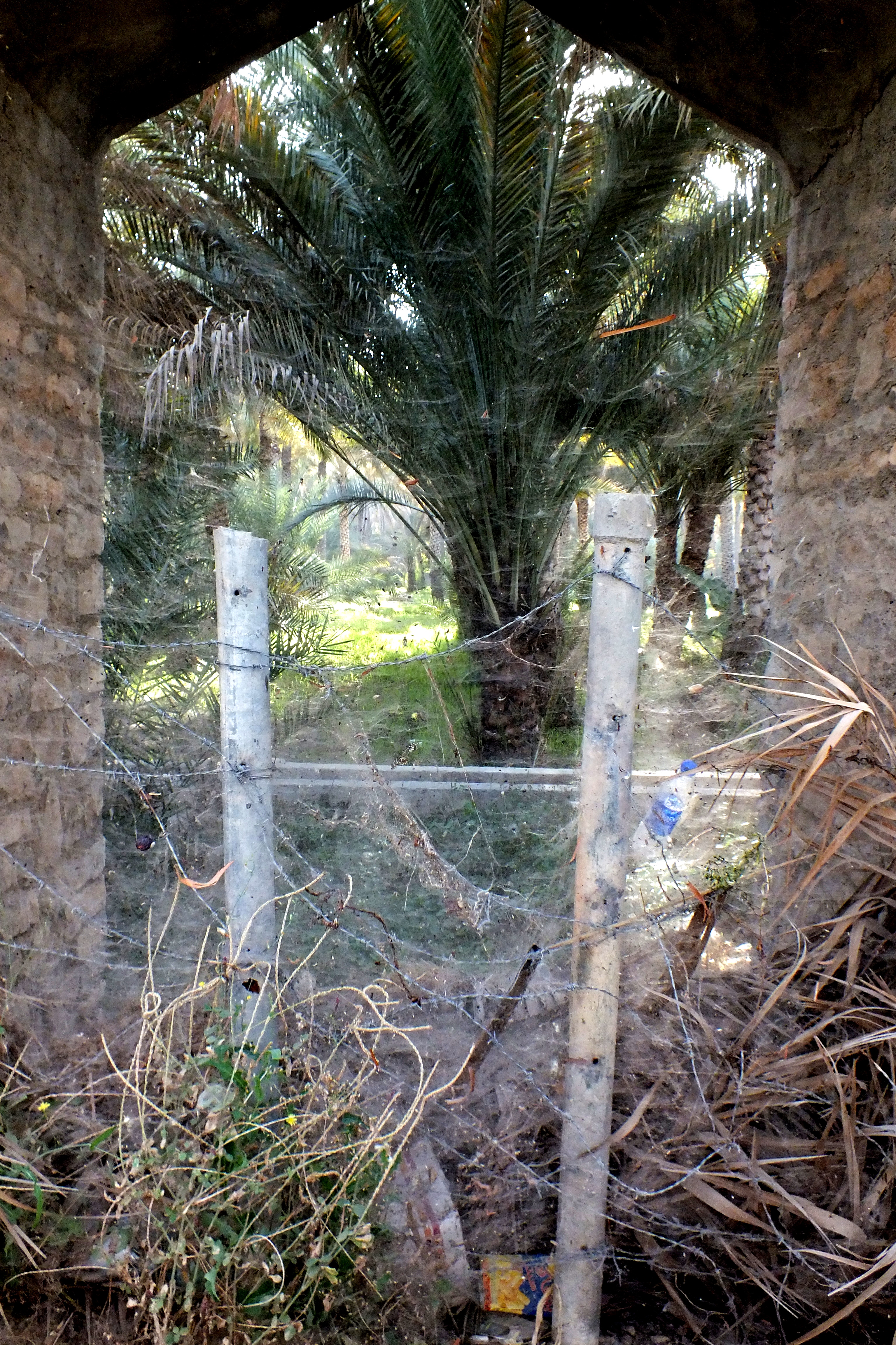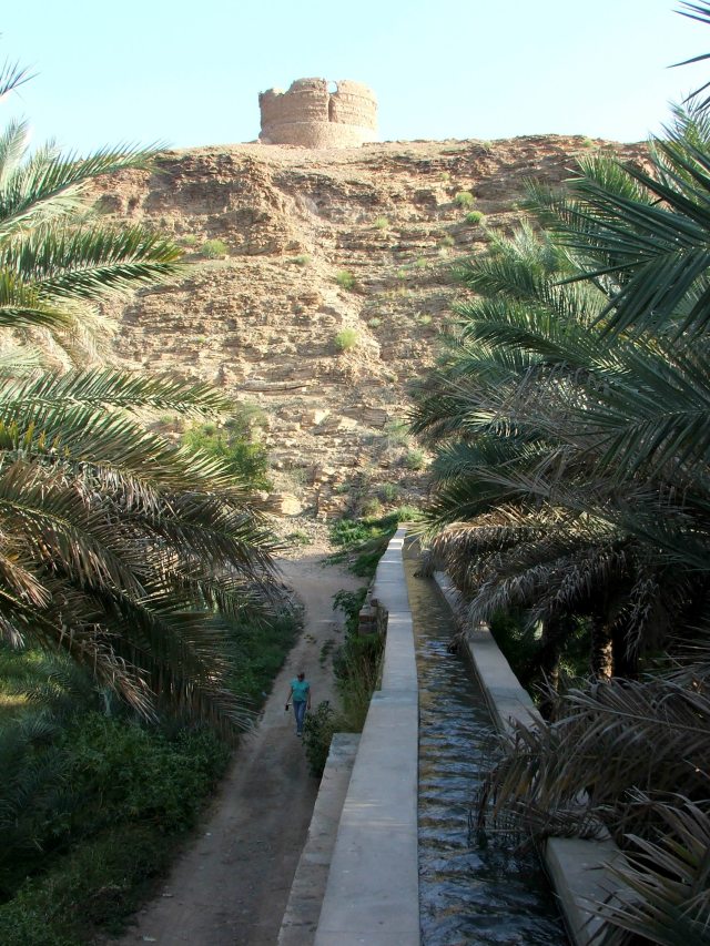 After clambering around and discovering what we could, we carried on to our planned destination – Birkat Al Mouz.  As well as the modern town, there is an ancient village there as well.  We drove through the town, looking for the best place to get close – and discovered the palm oasis – and the most wonderful falajs – or irrigation channels. (For more info, see this site – http://www.saudiaramcoworld.com/issue/198303/oman-the.falajs.htm)