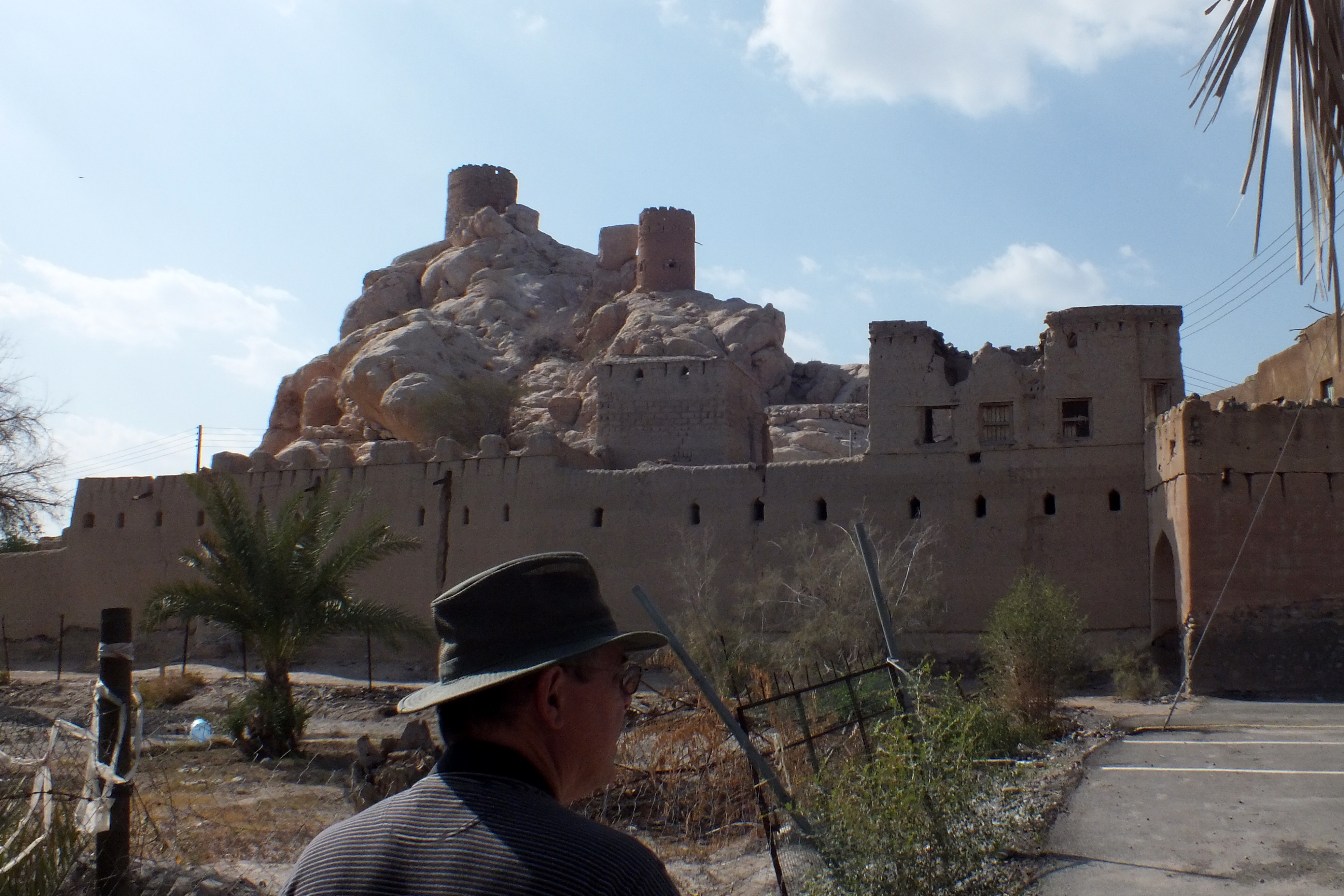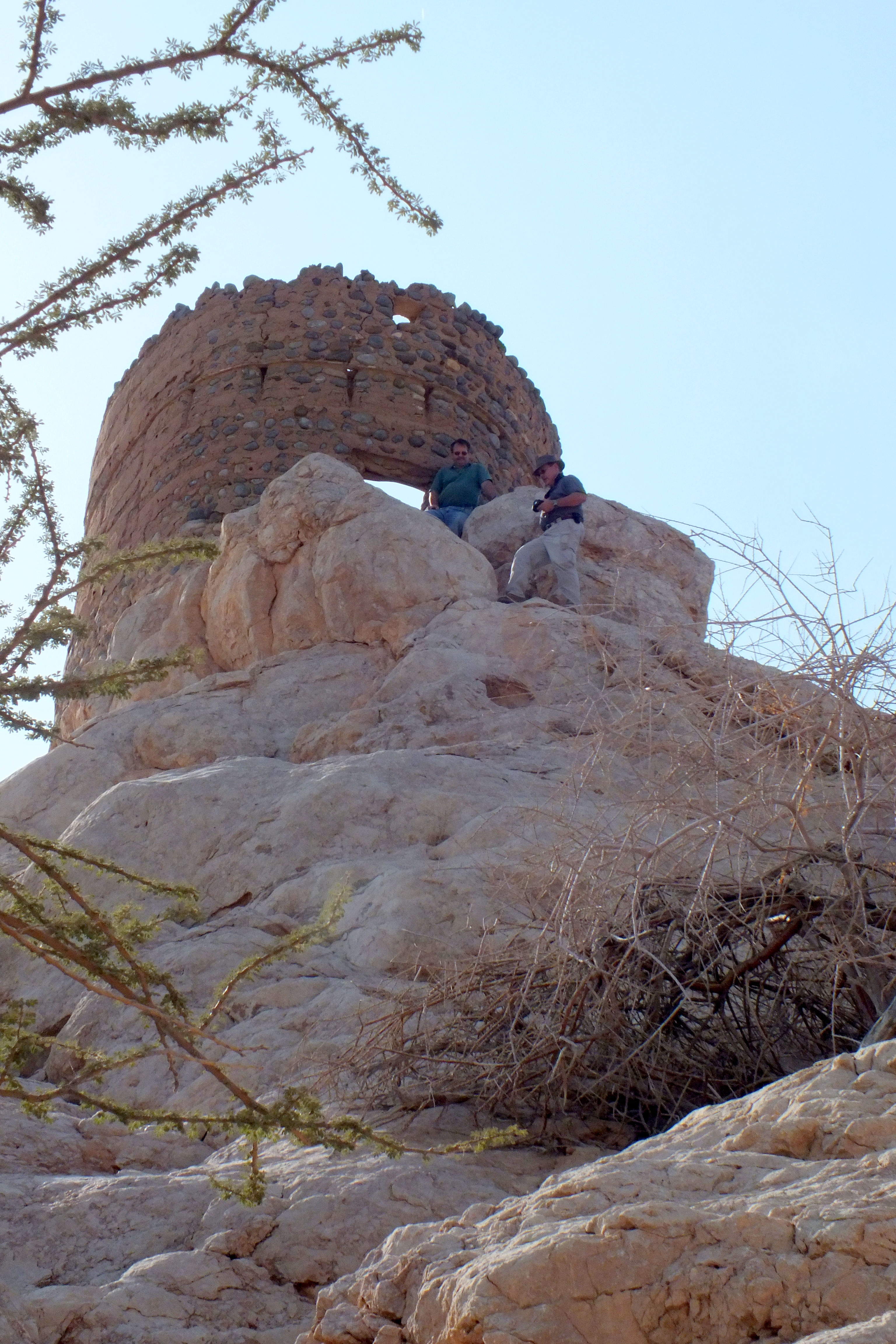 After leaving Sinaw market, and stopping to picnic under a tree, we started on our way home. Along the way, we came to a village – the two towers on a hill  with another close by looked intriguing, so we decided to see if we could get close for a good photo.Th hill is lime stone, and is called an exotic – the rest of the rock is ophiolite, which is the ocean floor. It is thought that these exotics were islands that got pushed up on the ocean plate when it came over the land plate as the mountains of Oman were formed.