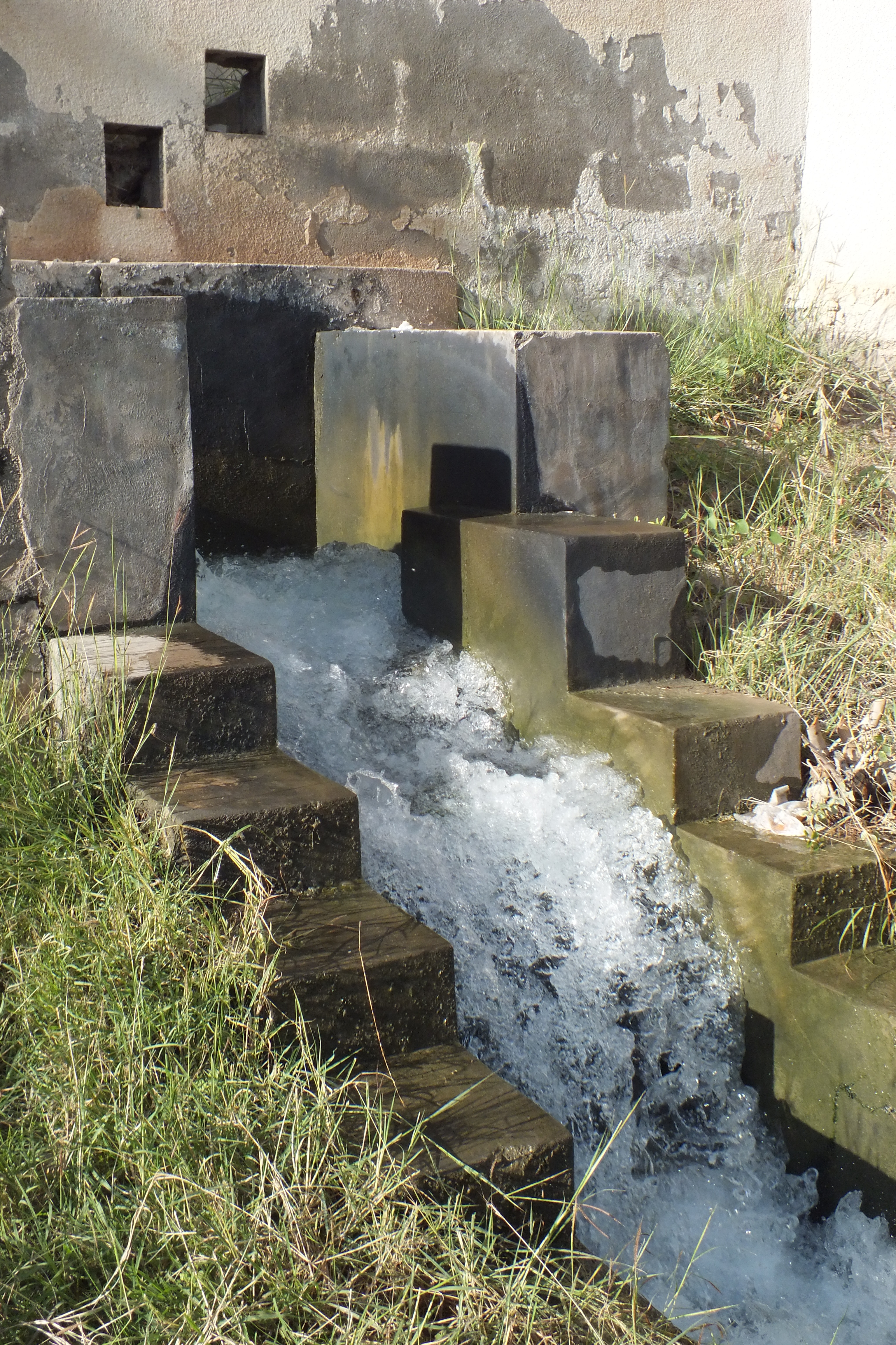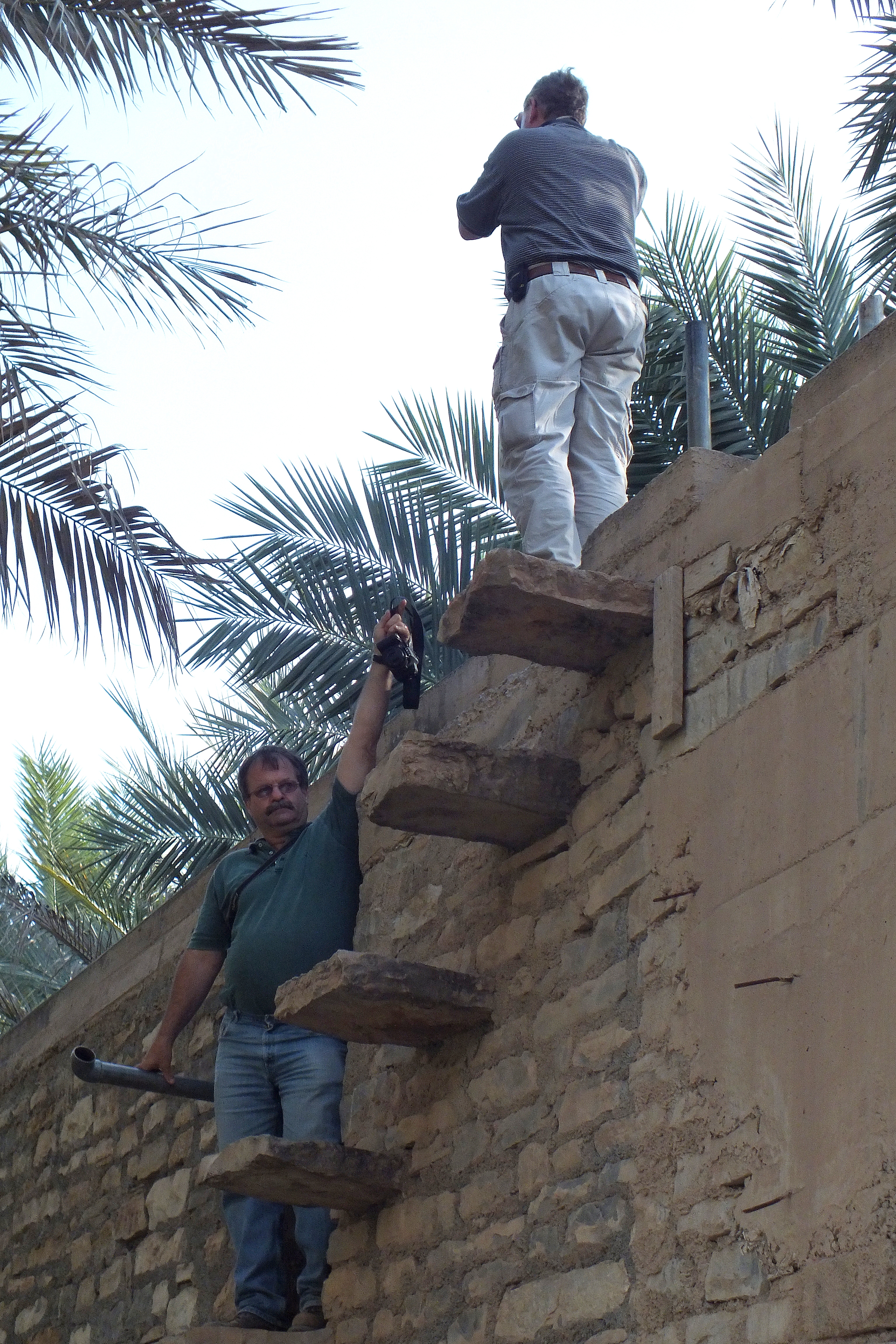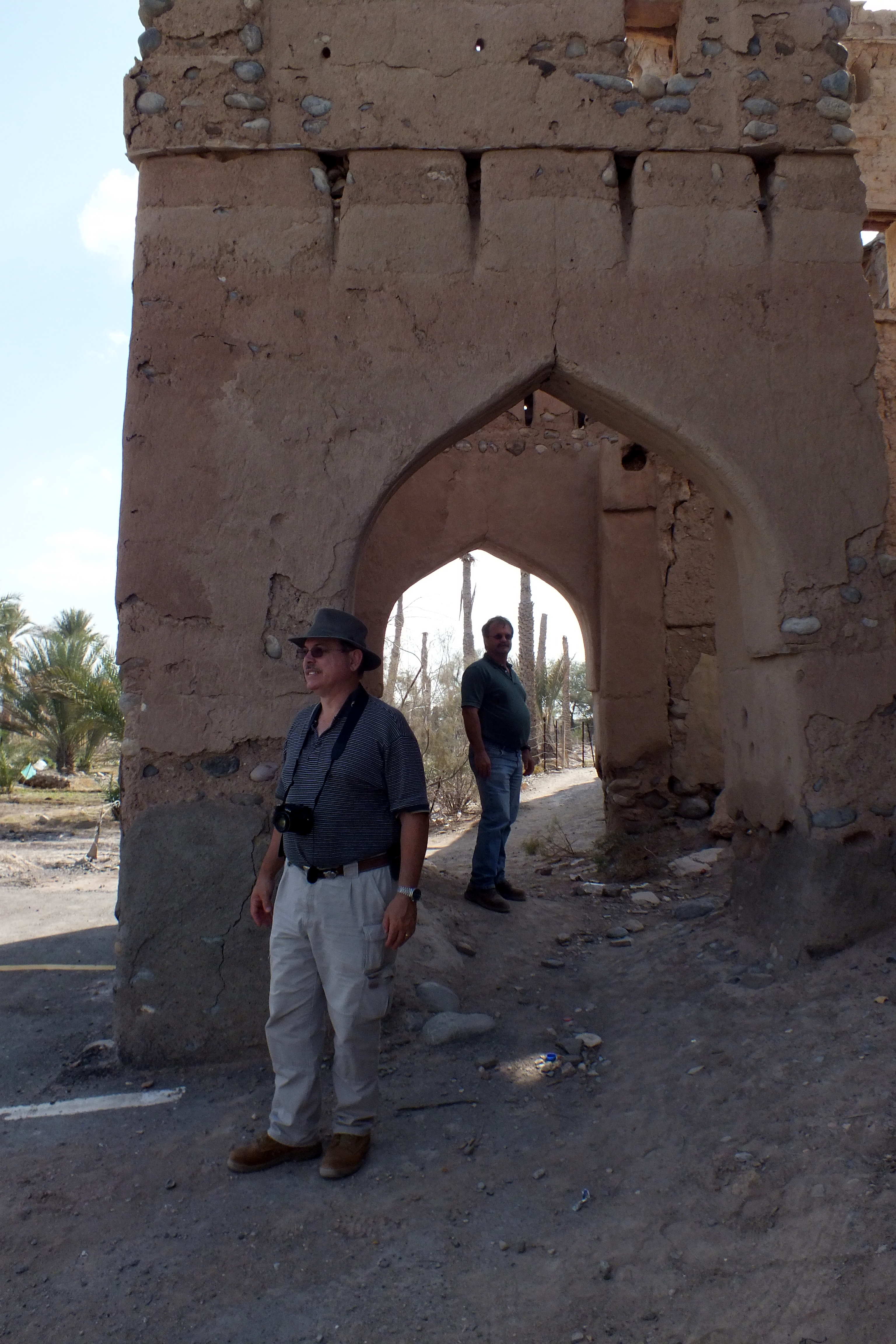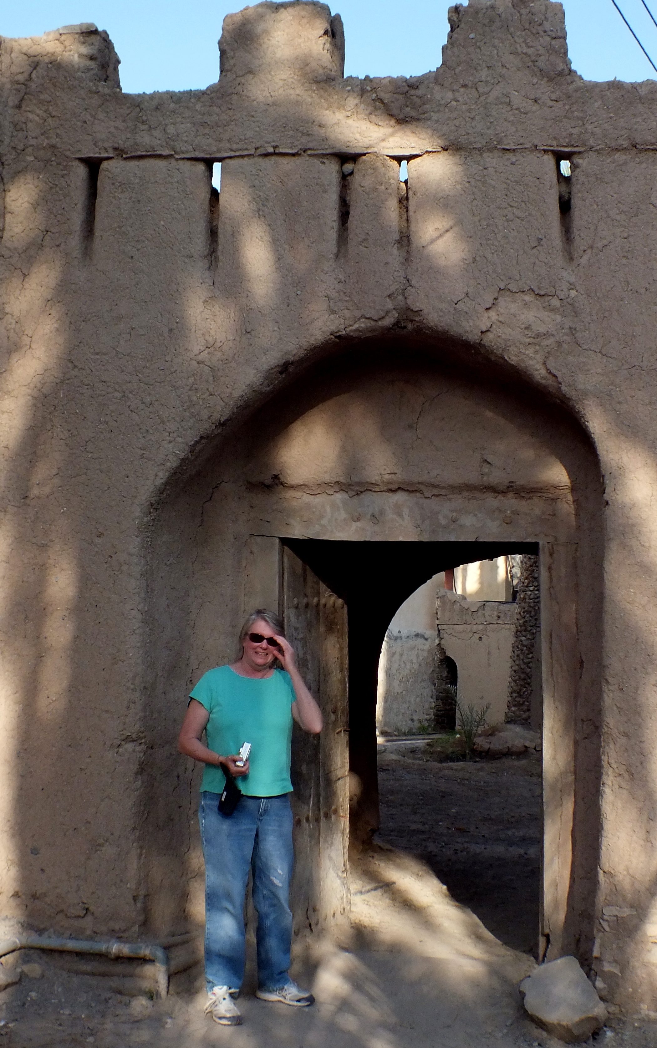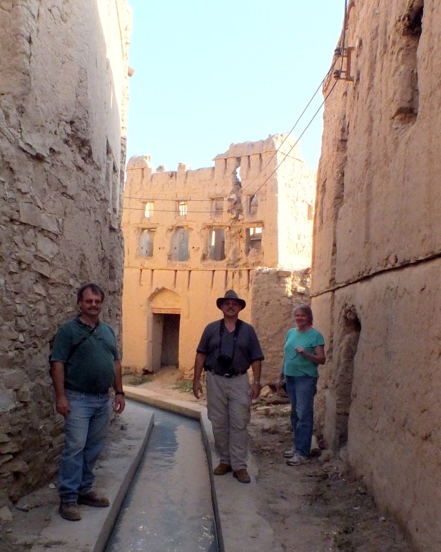 This one was very high above the ground – there were stairs to climb up – inside the wall, and then on the outside.  We left the climbing to Robert and David.See Alice walking beside the falaj – that show just how high it is.This opening in the wall obviously hadn’t been used in a long time – the “mist” you see filling it is all spiderwebs – I’ve never seen so many!This mosque is at the end – the water comes from this level.