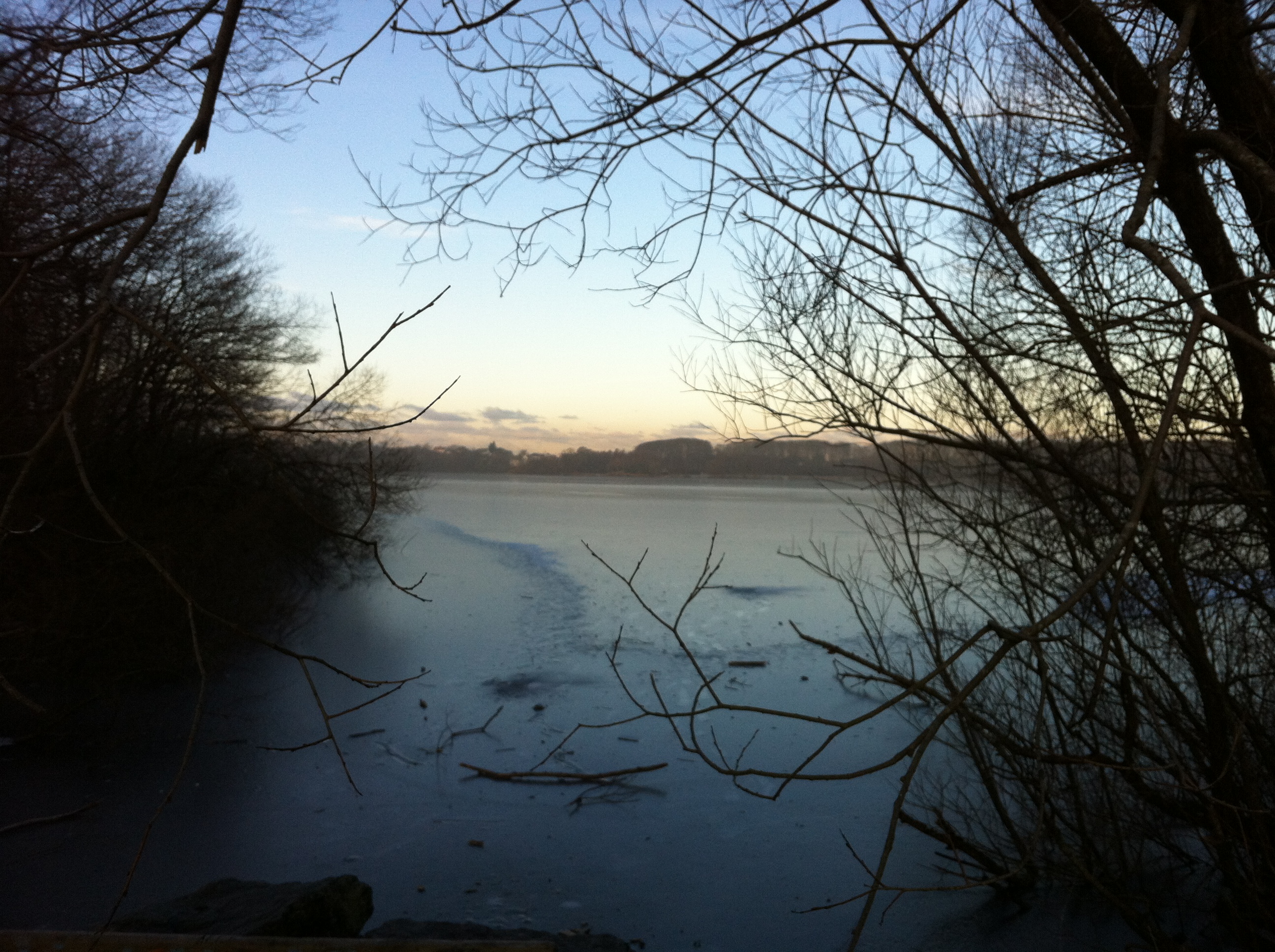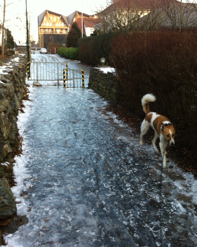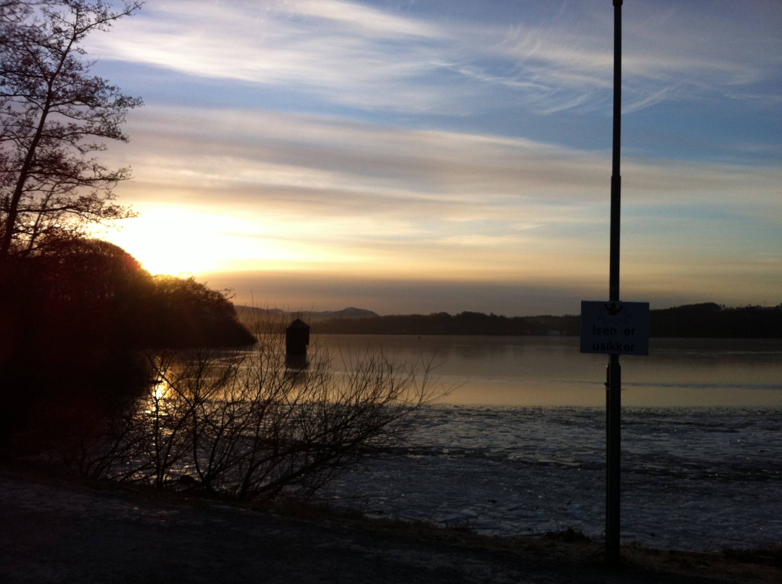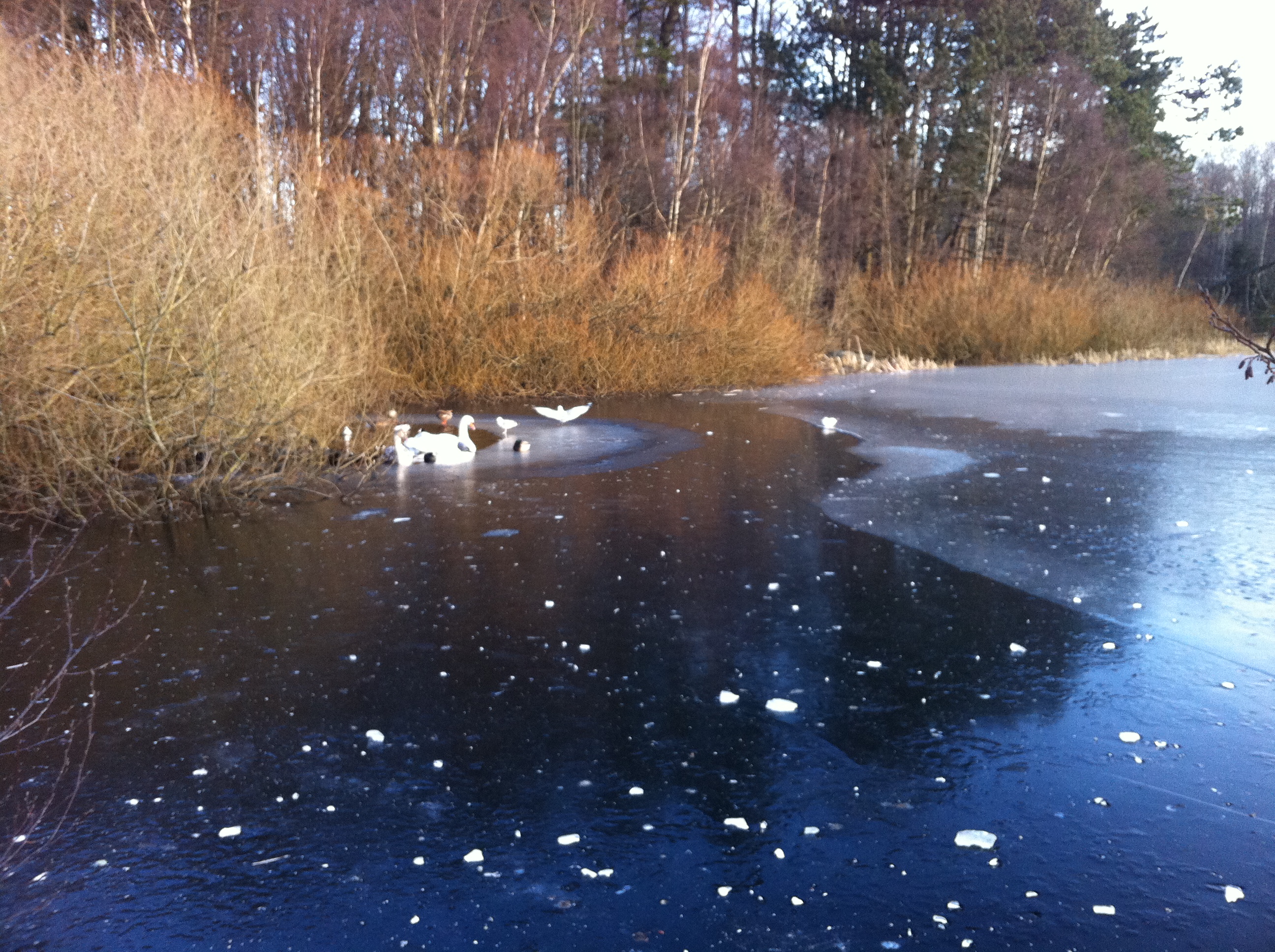 Thursday morning, a fine sifting of icing sugar snow fell, and the lake was transformed – no more reflections in the mirror-like ice. They are talking about more cold – and more snow – which will mean more ice when it warms up…….. and then, I imagine, we will get the rain that Stavanger is famous for.