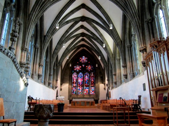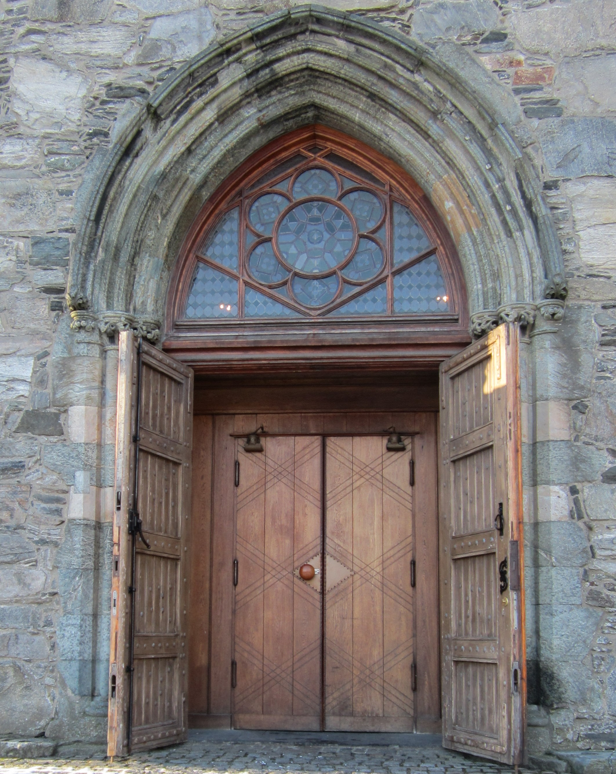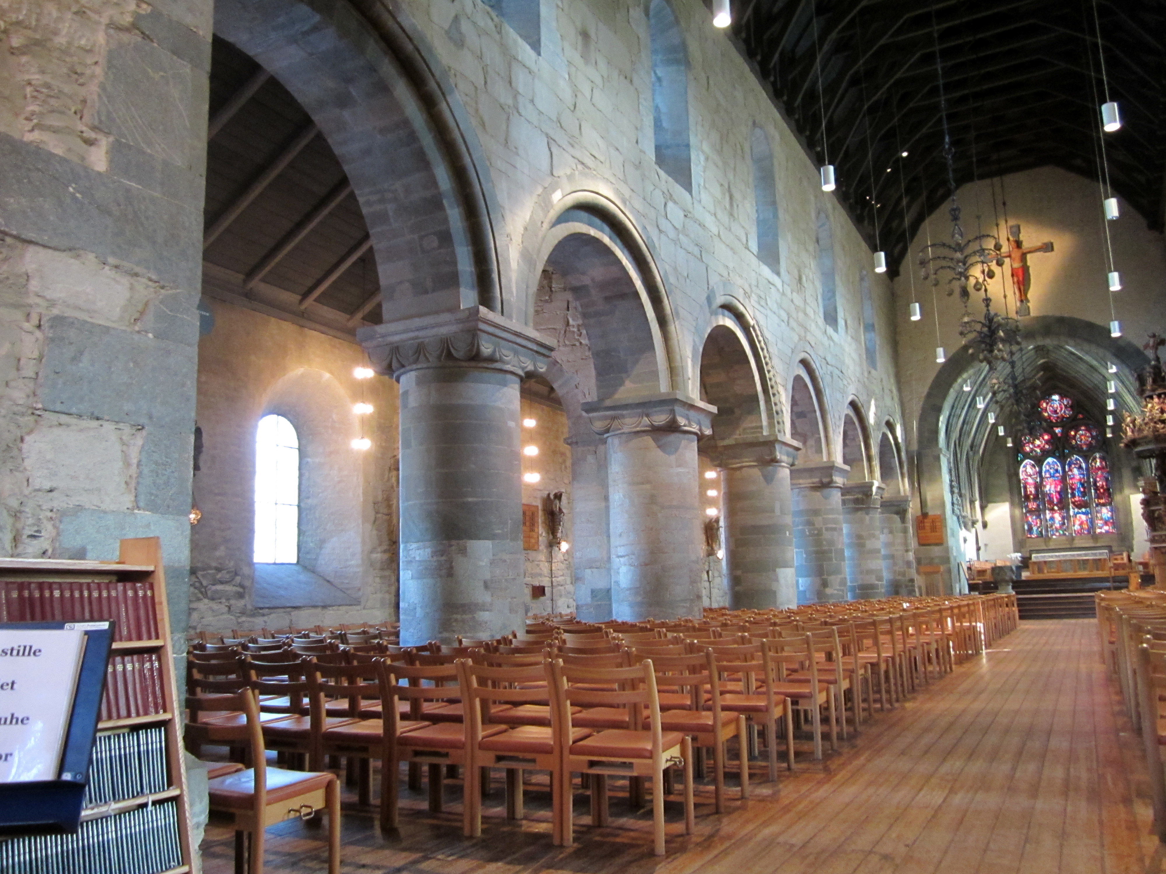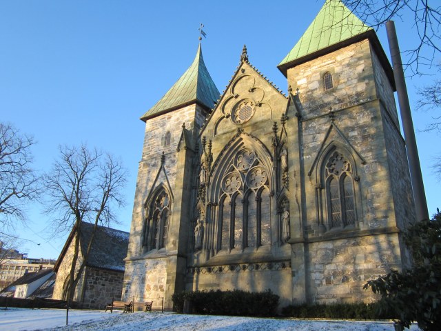 Stavanger Cathedral was started in 1123 – 1128 by Bishop Reinhald (or Reginald) who came from Winchester, England. Th is explains the Anglo-Norman architecture. It had a tower and a square chancel which were destroyed by fire in 1272, and the rebuilding was done in the newer Gothic style, with two towers and a magnificent chance. On the outside wall, you can see the difference in the two periods.