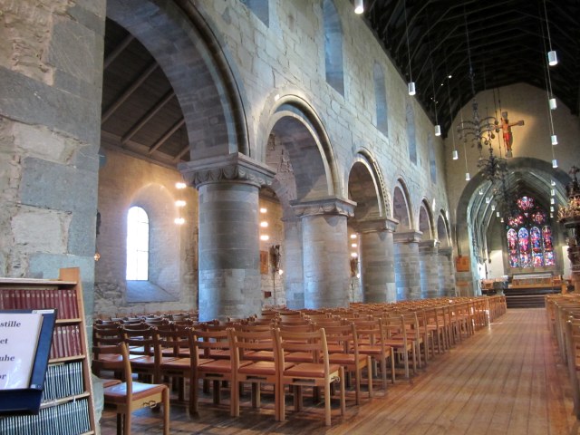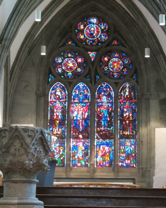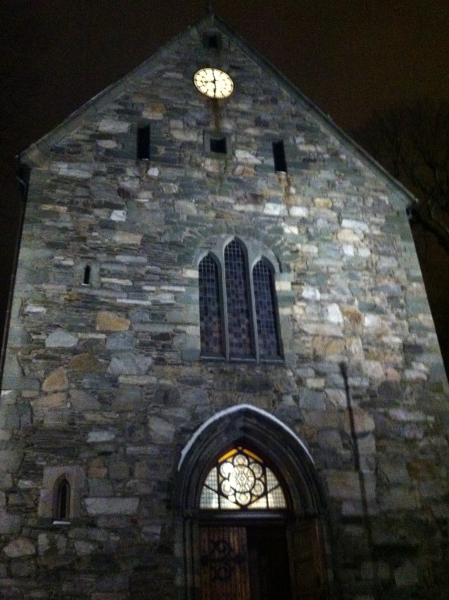 The choir came up the aisle – young people of university age, all dressed in black. They started right in with some very old church music – and one could immediately understand why so much of it was contrapuntal. The harmonies wove around each other, echoing off the stone walls and the sound was ethereal. I wasn’t sure how David would like a whole evening of this, but I needn’t have worried. After an explanation of the piece and the next few pieces, in Norwegian which, of course, we didn’t understand a word of, they were singing again – in French and Norwegian and English…. and a bit of German as well, but I’m not sure.