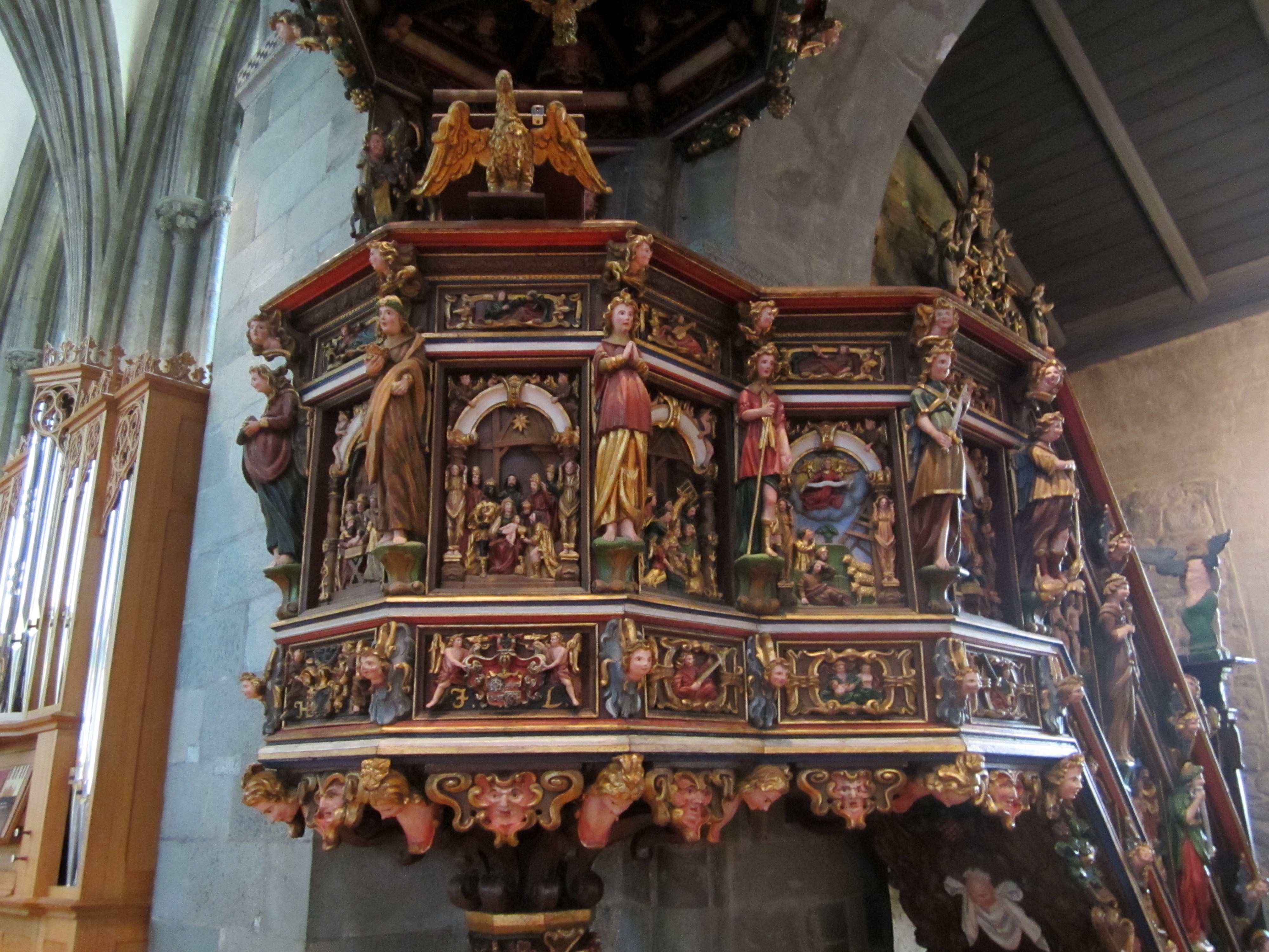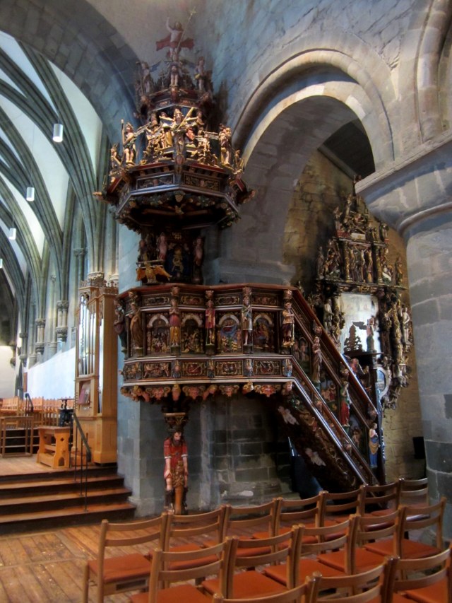 The ornamentation of the pulpit, in the Baroque style of the 1600 contrasts sharply to the serenity of the older parts of the church.