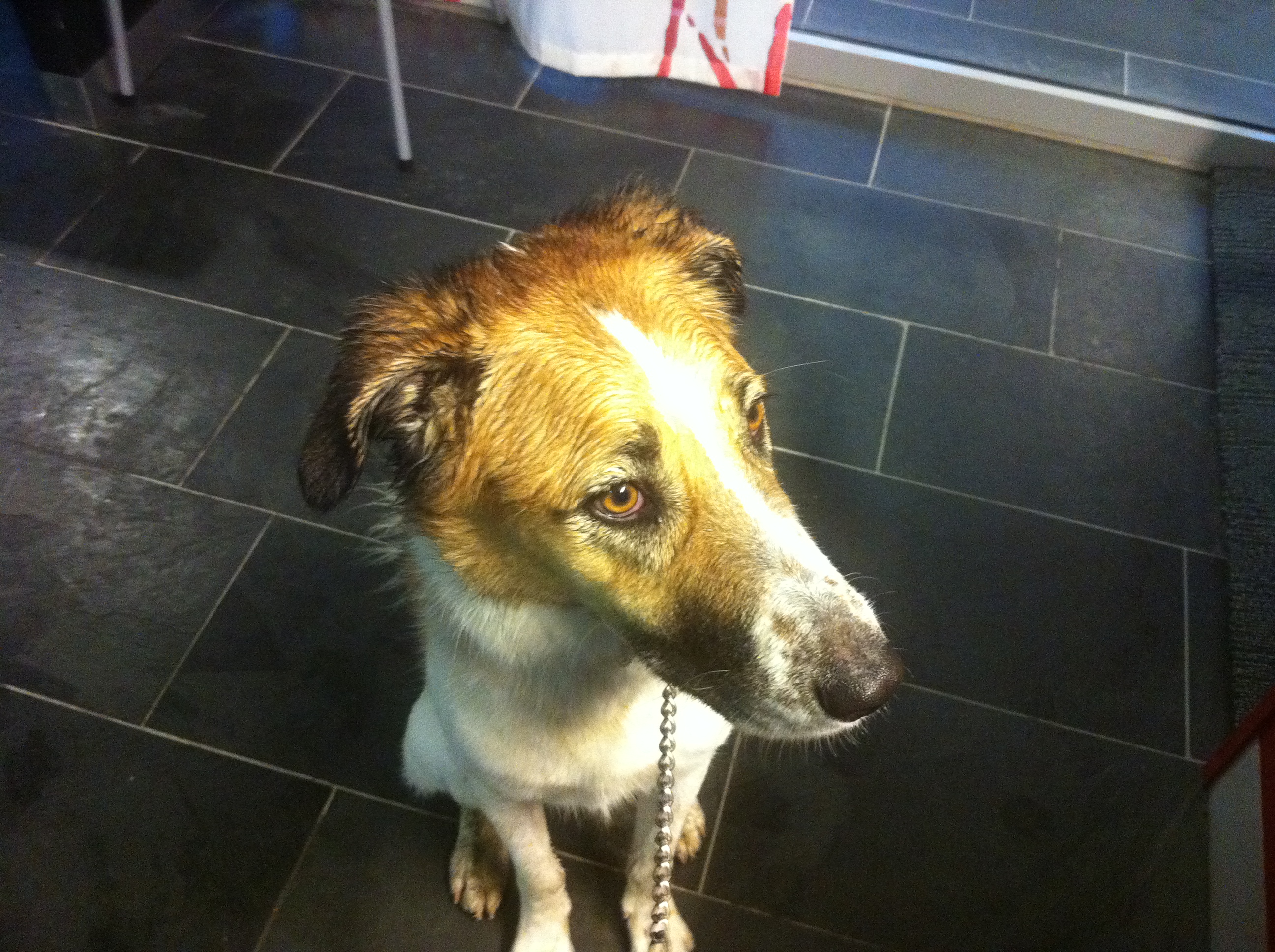 Snoopy came into the office with me – it is a huge place, where people go to apply for residency in Norway, change their address, get their tax cards and ID numbers…. Fortunately, my number came up right away, so Snoopy didn’t have to sit still for very long.   He didn’t look that happy though – all shaggy/fluffy looking and wet.