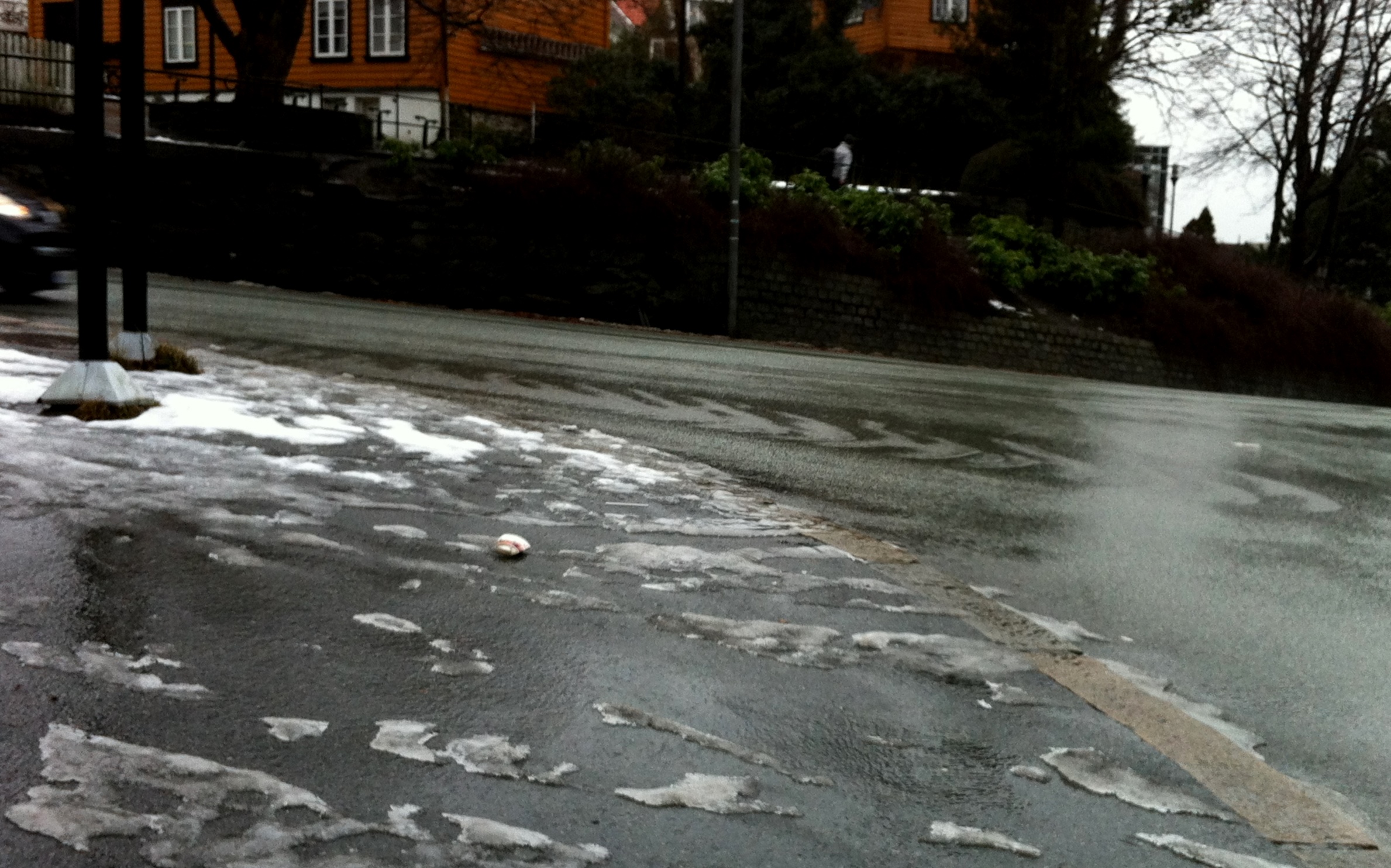 The ice was Very icy – and until we got to a main street and bare sidewalks, we walked in the centre of the streets – fortunately  they weren’t busy. the water was running down the sidewalks as we descended towards the centre of town.  Look at the pattern in made on the street here –