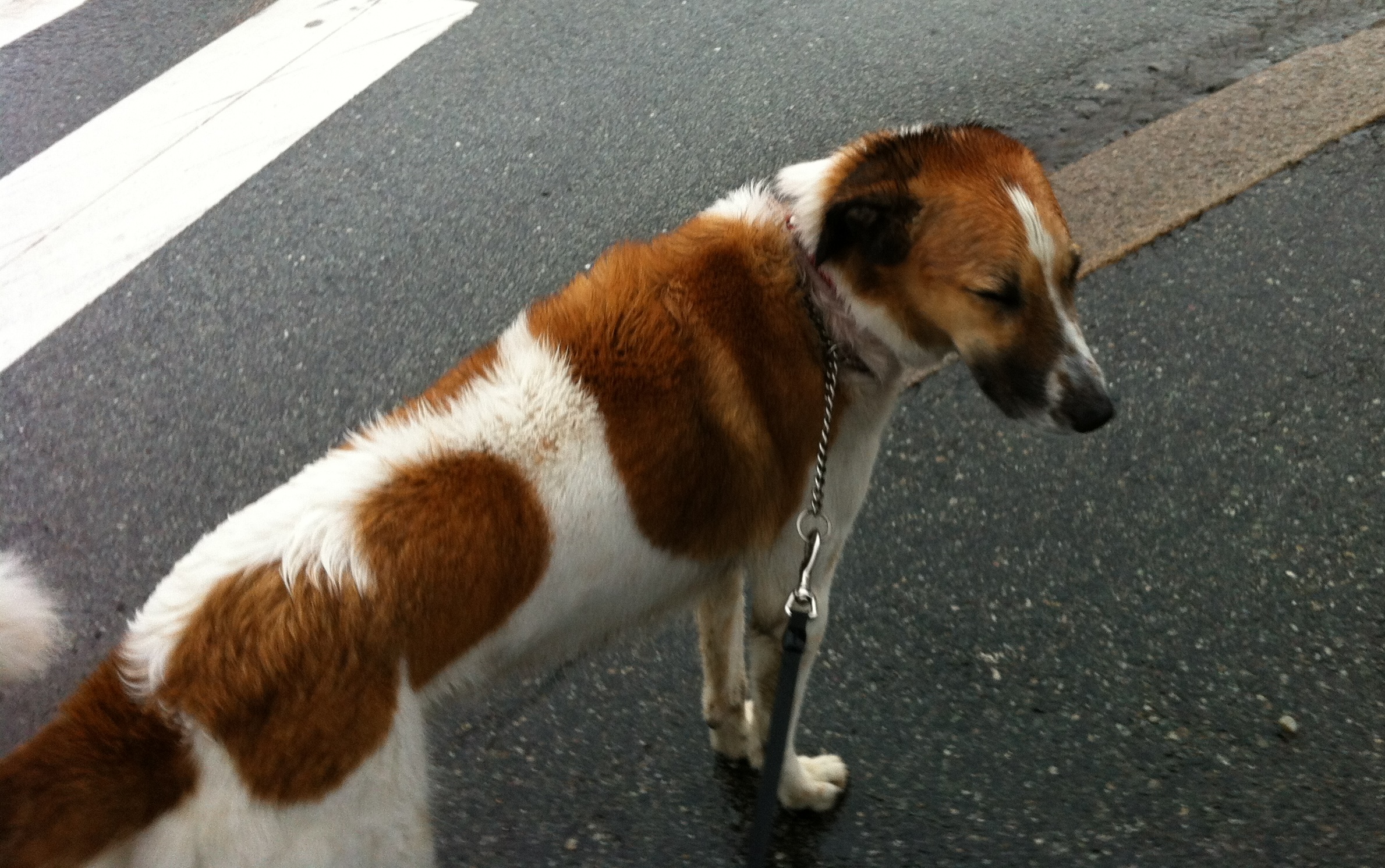 Snoopy, being a Kuwaiti dog, born and resident in the Middle East (until 3 weeks ago), is used to sun and heat.  He has never really been out in the rain before, barring the bit of sleet a week ago, and never for so long. He was less than impressed!