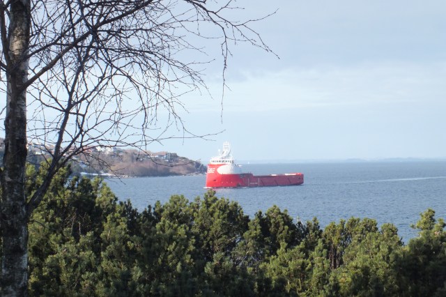 On the walk, we saw several supply ships coming in from the offshore platforms in the North Sea.                                                                                                                                          David is amazed at how much larger they are than even the ones off Newfoundland.  I just loved the colours, especially the red with the blue water and green trees.